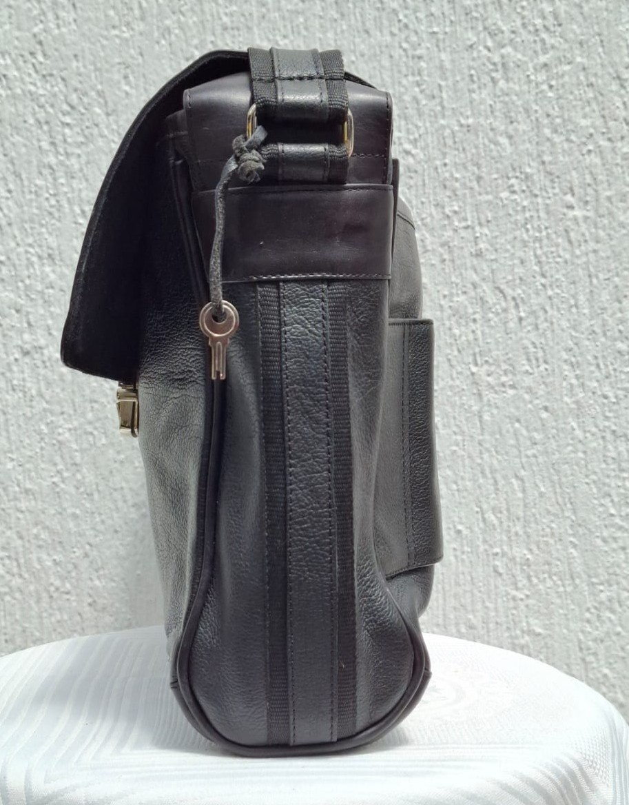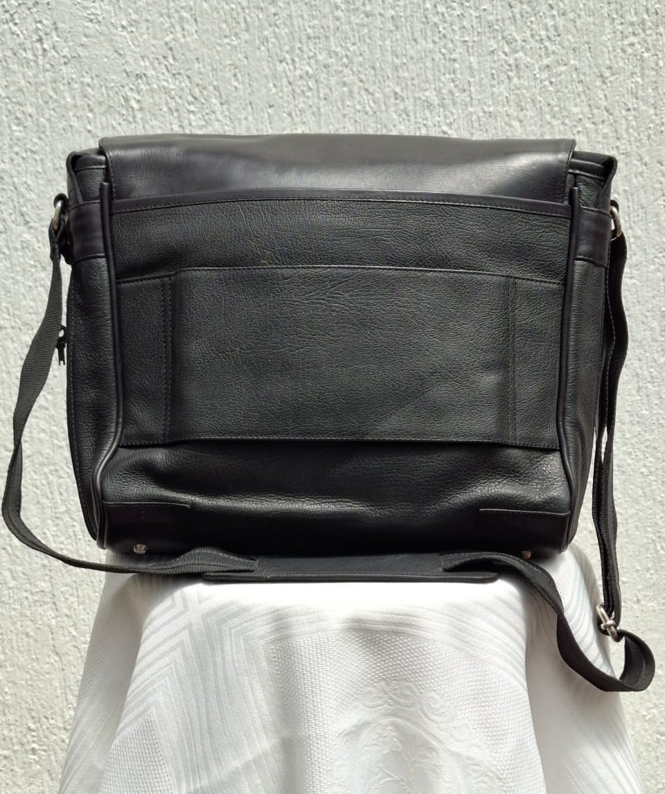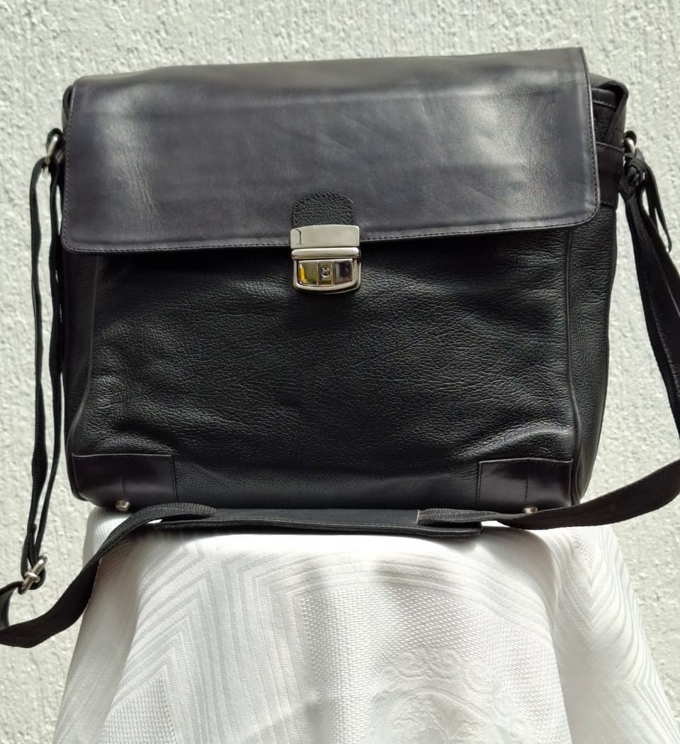 Maletín amplio color negro de piel de Borrego Peligüey (Borrego Tabasco). Ideal para guardar documentos y laptop. Tiene soporte para transportar en el aeropuerto en el equipaje rodante