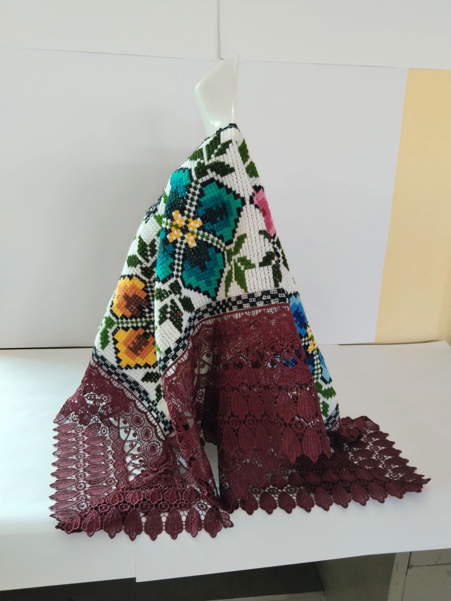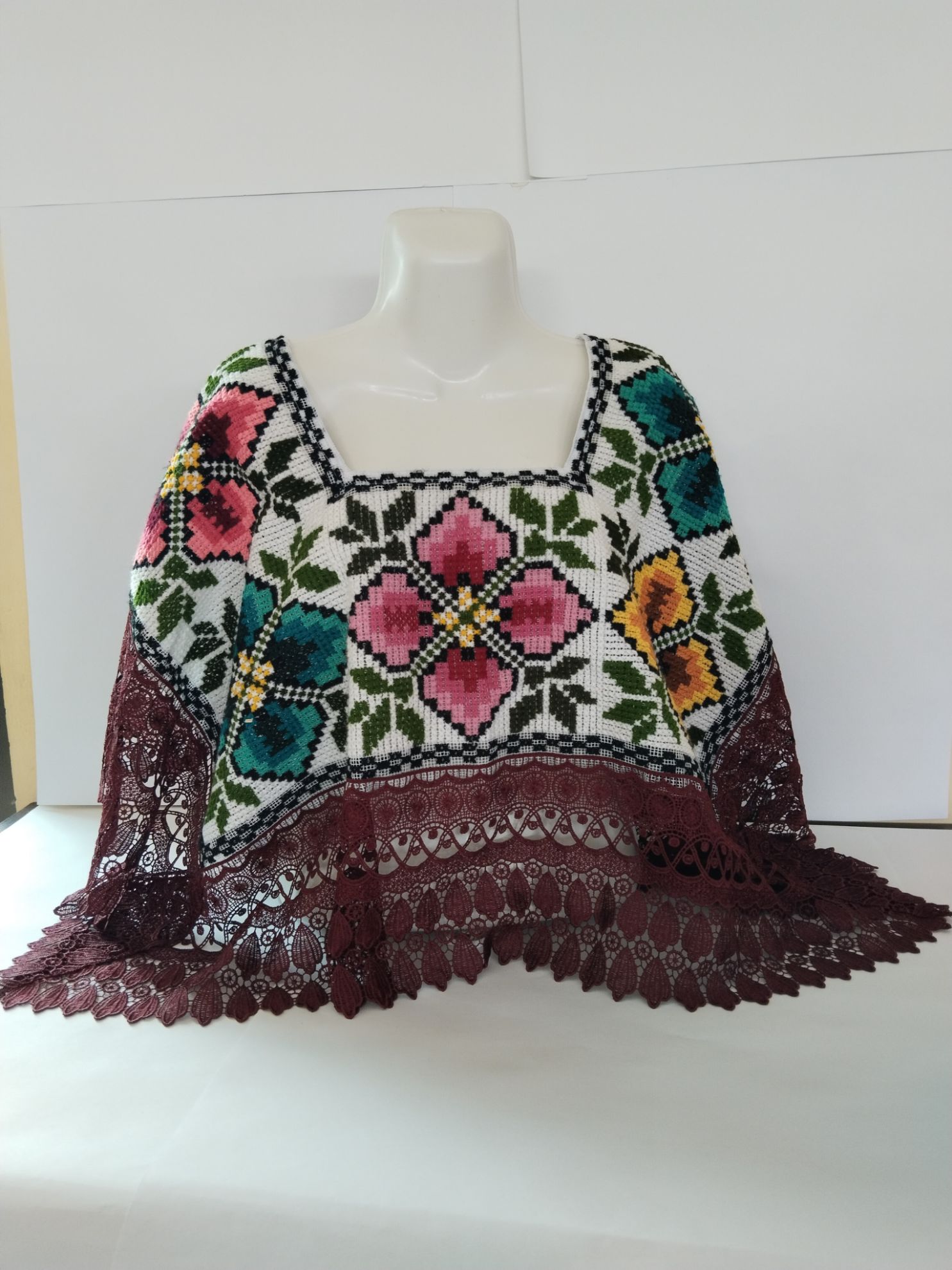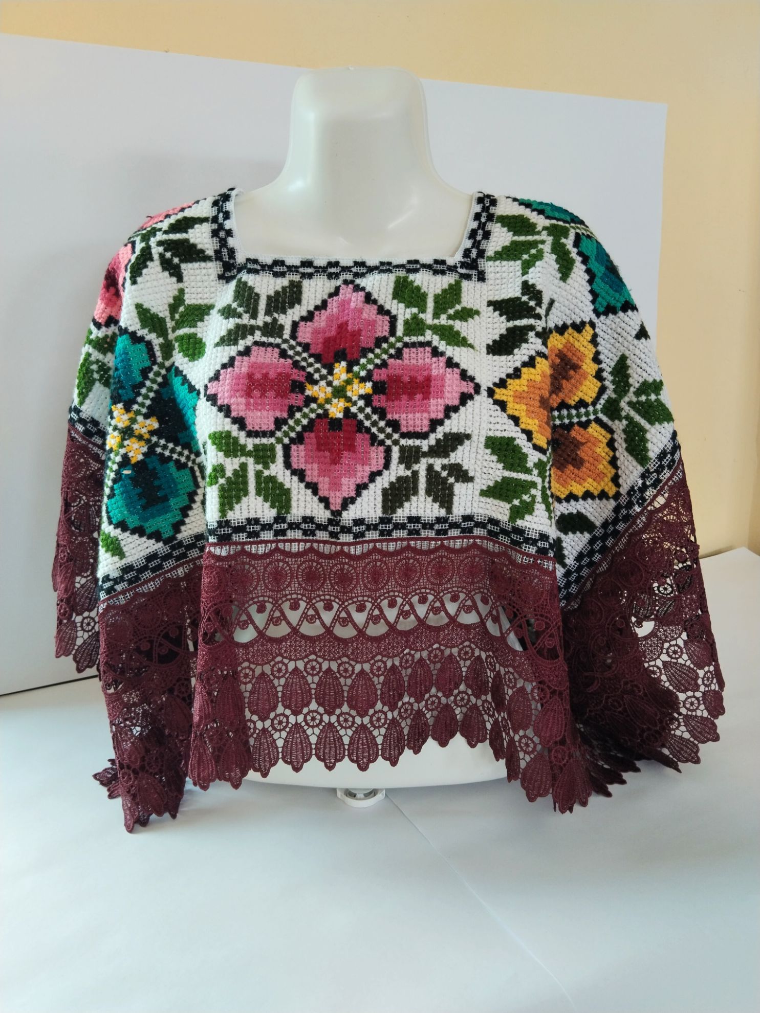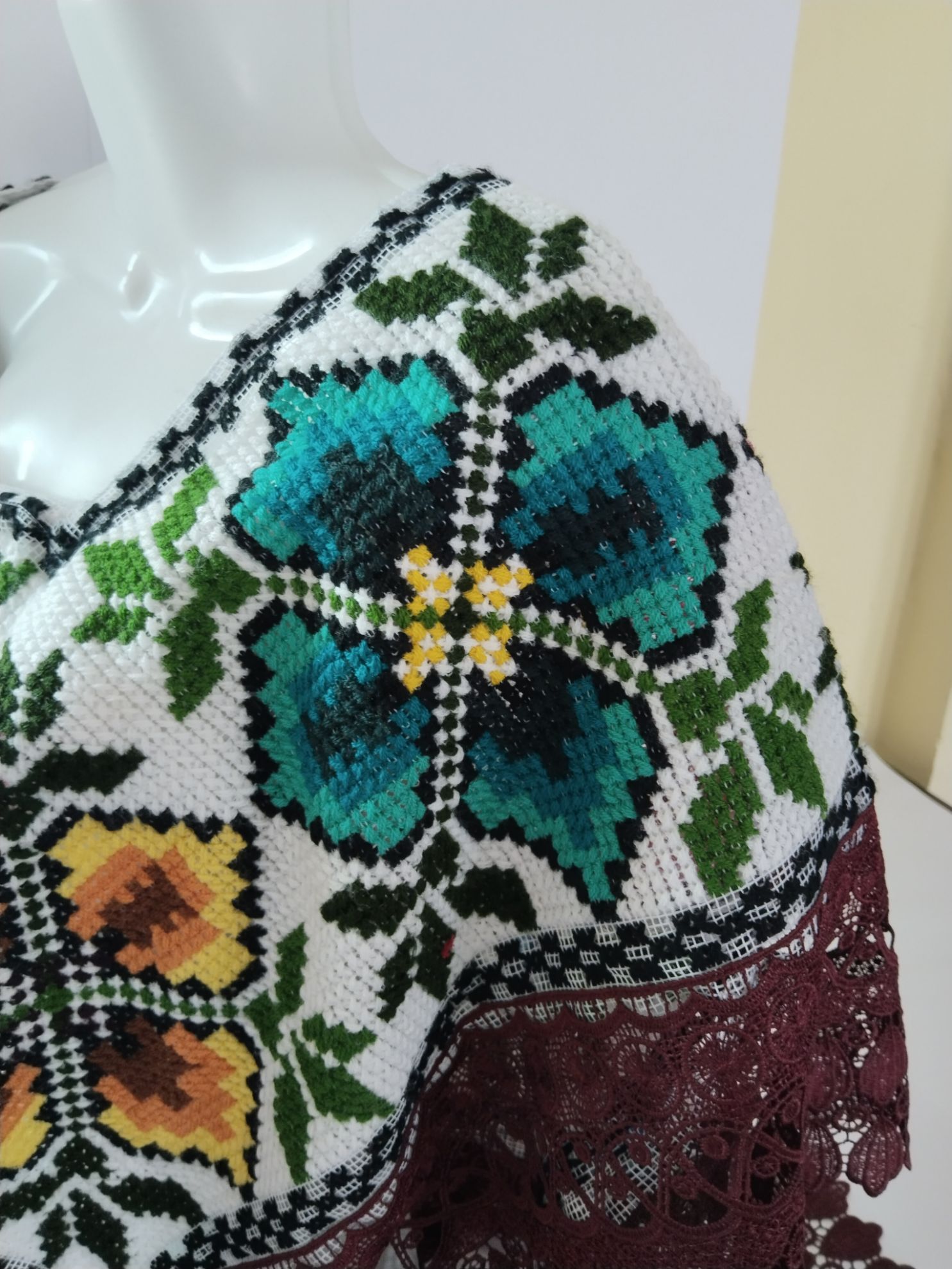 Solapa para dama unitalla , flores bordados con encaje inglesa bordada a mano en punto de cruz doble ,sobre malla sintética ,tiempo de elaboración 2 meses , lavar a mano con agua tibia jabón neutro secar colgado.