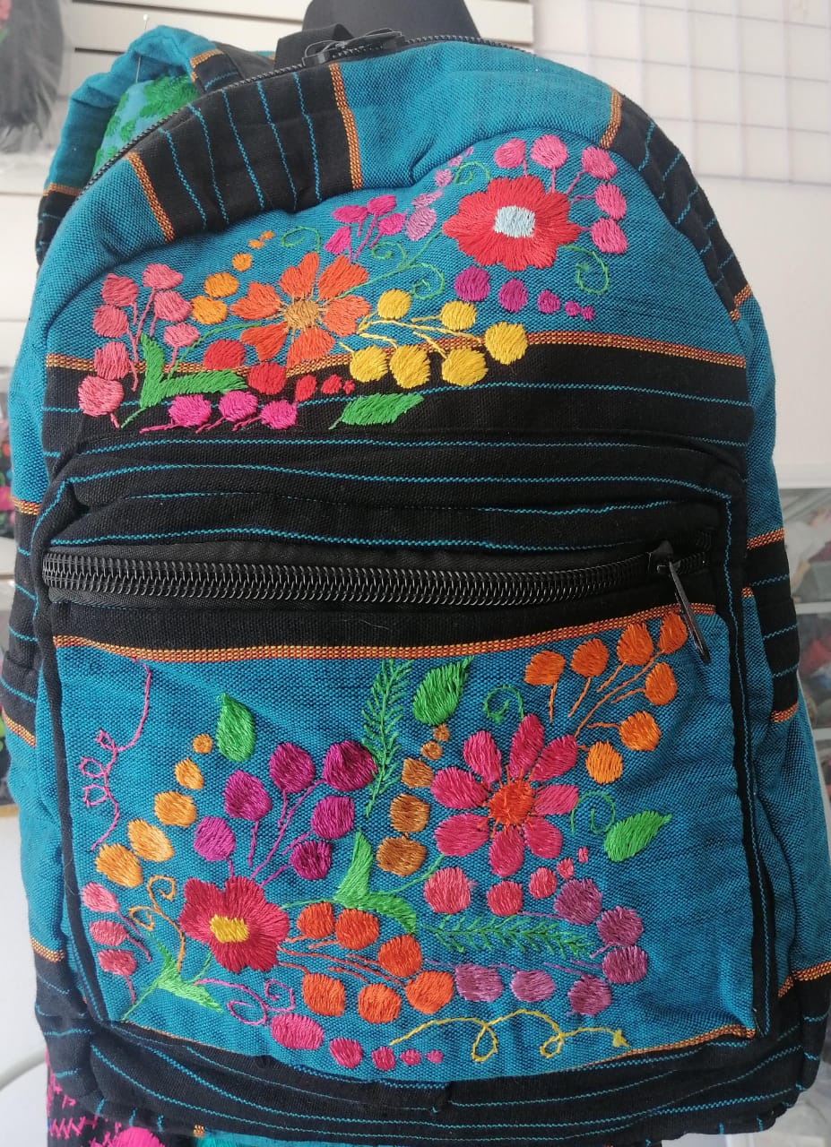 Es un mochila tamaño mediano de 39 cm de alto, elaborada a base de telar de pedal, reforrzada con tela mezclilla o tela paleacate por dentro, cuyo bordado se puede apreciar en la parte frontal de cada mochila, un bordado totalmente a mano con hilos de seda, se maneja en dos tamaños medianda y agrande.