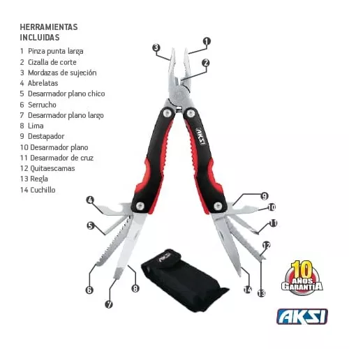 VERSATIBILIDAD INCOMPARABLE: La herramienta de acero inoxidable AKSI te ofrece 14 funciones esenciales, incluyendo destornillador, abrelatas, cortador de cables, sierra y mucho más, todo en un diseño compacto y fácil de transportar con su estuche de tela incluido para llevarlo en el cinturon del pantalón.