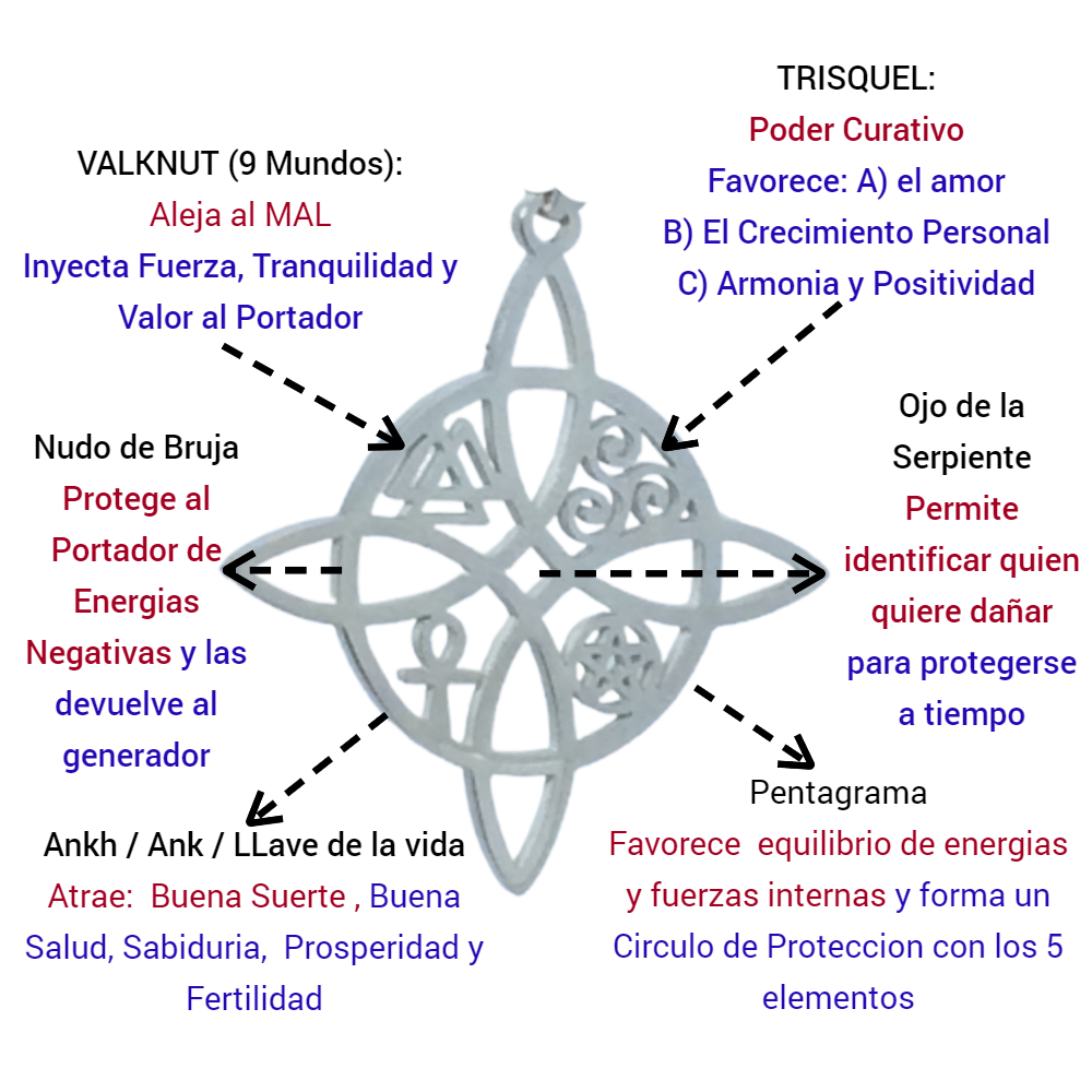 La Voz Popular dice que El NUDO DE BRUJA Protege al Portador: repeliendo y devolviendo las energías negativas al generador de las mismas y protege al portador 2.- LLAVE DE LA VIDA O CRUZ EGIPCIA O CRUZ DE VENUS o Anj o Ankh o Cruz Ansada LLave de la Vida: atrae la BUENA SUERTE, Brinda Protección contra energías negativas, y contra enfermedades físicas o psíquicas, favorece la sabiduría de quien ha vivido muchas vidas, aleja conflictos judiciales y favorece la CREATIVIDAD y la fertilidad. 3.- VALKNUT: (9 Mundos): Aleja al MAL Inyecta Fuerza, Tranquilidad y Valor al Portador 4.- TRISQUEL / TRIQUETA / TRIADA: Poderosísimo Símbolo A *talismanes+poderosos, Nudo de Bruja y Luna, Luna, amuletos poderosos, talismanes poderosos,Regalo , Dije Mujer, Dije Protector, Amuleto, Poderoso Talisman