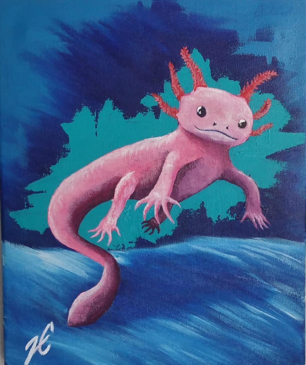 Recordando a una especie en peligro de extincion, obra artistica elavorada a mano con una tecnica mixta en colores azules y verdes de fondo y rosa,violeta, blanco y naranja para dar vida a este hermoso animal de la cultura mexicana.