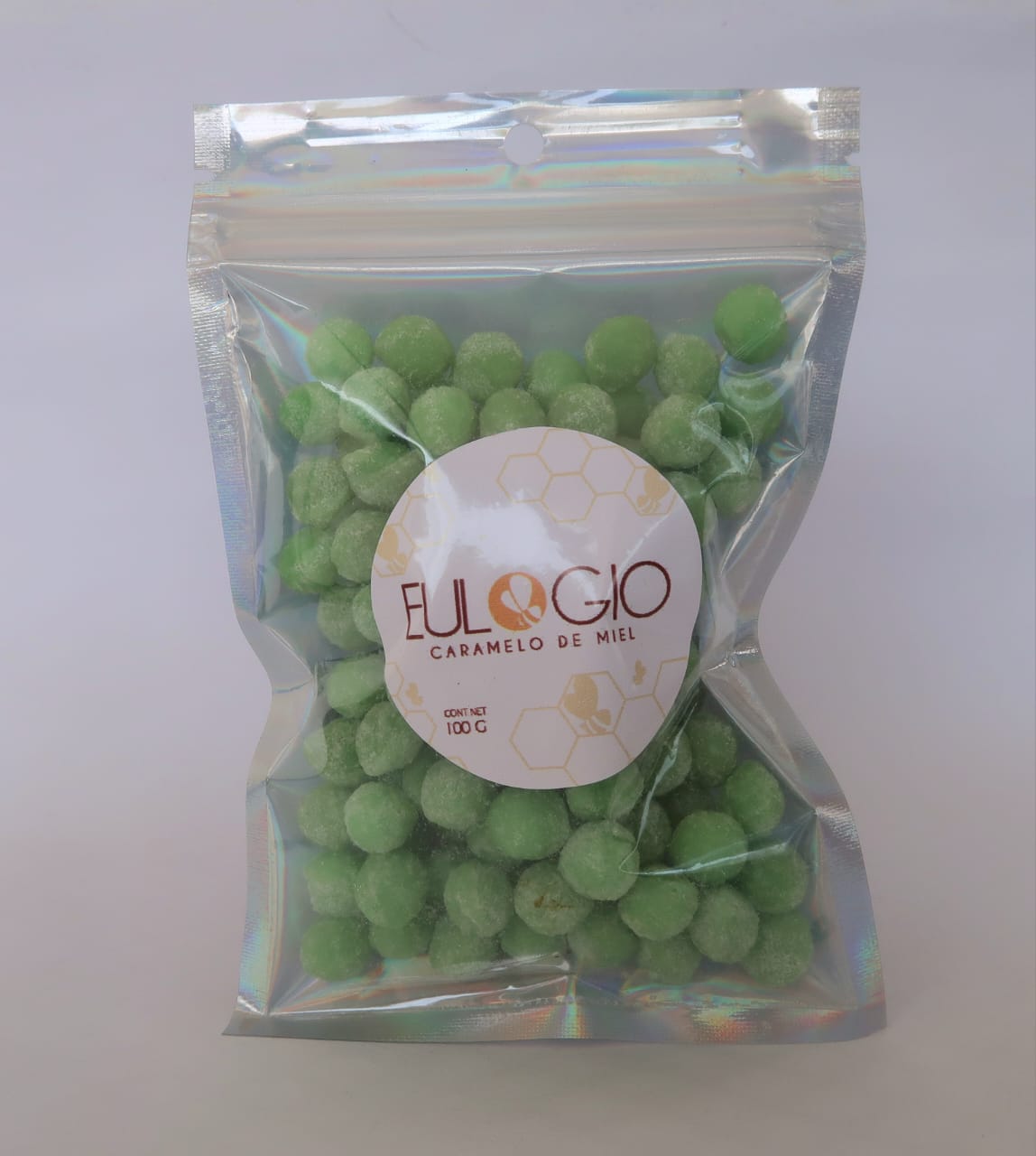 La perlas de miel está elaborado a base de miel con esencia natural de clorofila; bajo un proceso 100% artesanal, cuidando los niveles de temperatura para mantener las propiedades de la miel y la clorofila sin la incorporación de ningun aditivo o conservador; para que ud pueda degustar el sabor y la frescura de la miel 100 % narural y el propoleo; esta enbasado en una bolsa hermética resellable,holográfica de aluminio y laminado en ambos lado., al frente transparente.