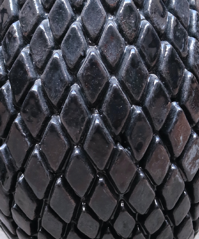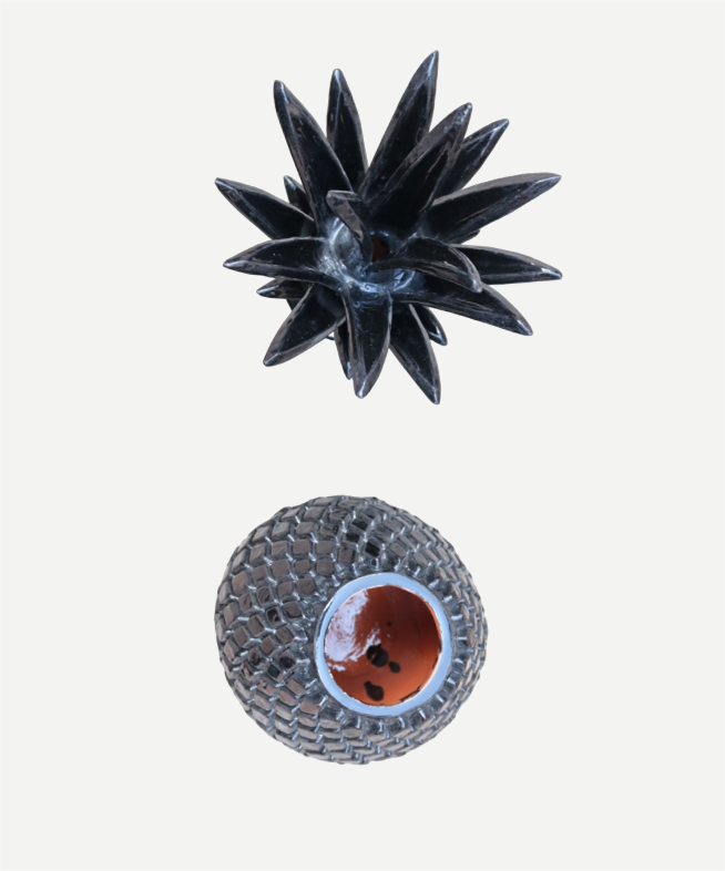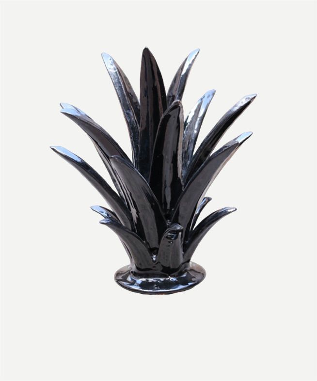 Esta hermosa piña negra es una pieza única y artesanal de la comunidad de San José de Gracia, Tangancícuaro, Michoacán, México. Está pieza hecha de barro con la técnica de alfarería vidriada, se caracteriza por su brillo y sus colores vibrantes. La piña tiene una forma tradicional y está decorada con motivos florales y geométricos.