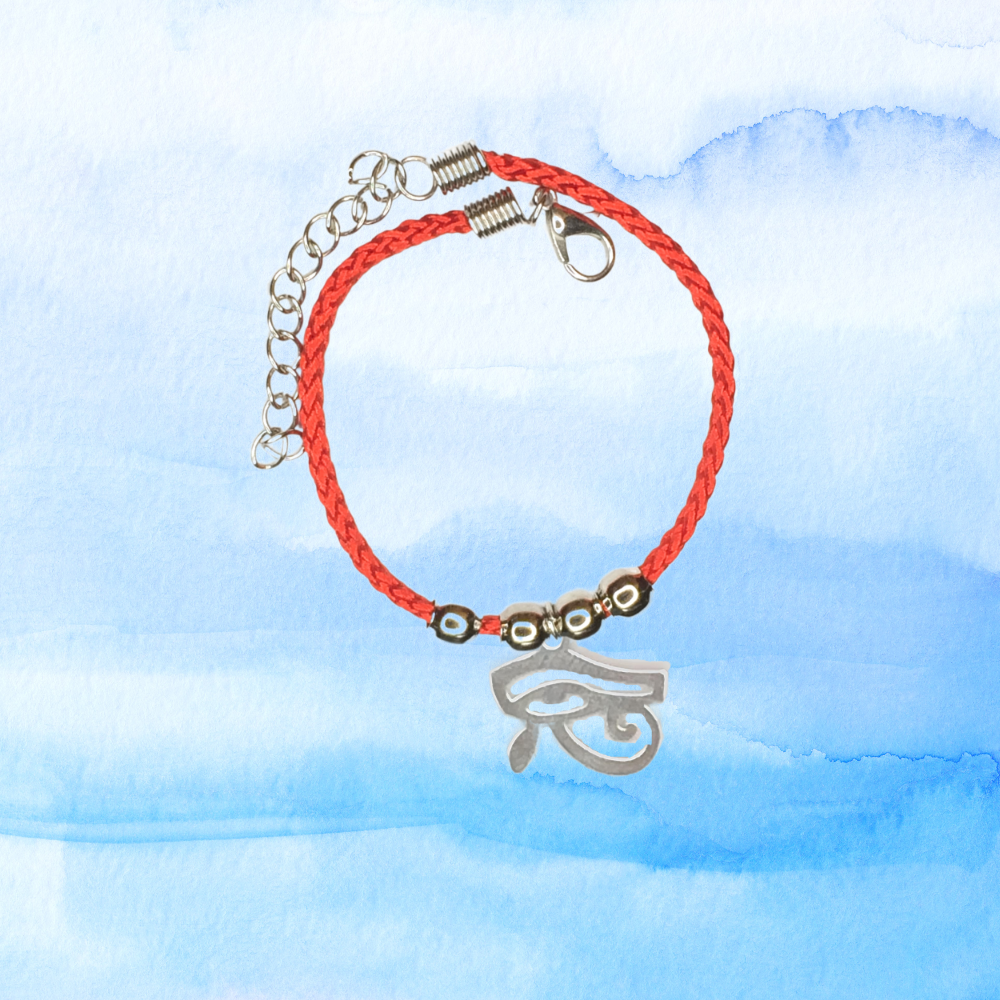 ****** 1 Dije Ojo de Horus 20x29 mm acero Alta Durabilidad + Pulsera Roja Borlas Hasta 21 cms de Perímetro Para Muñecas Desde Delgadas hasta Medianas ALTA DURABILIDAD (DIJE CURADO) *****