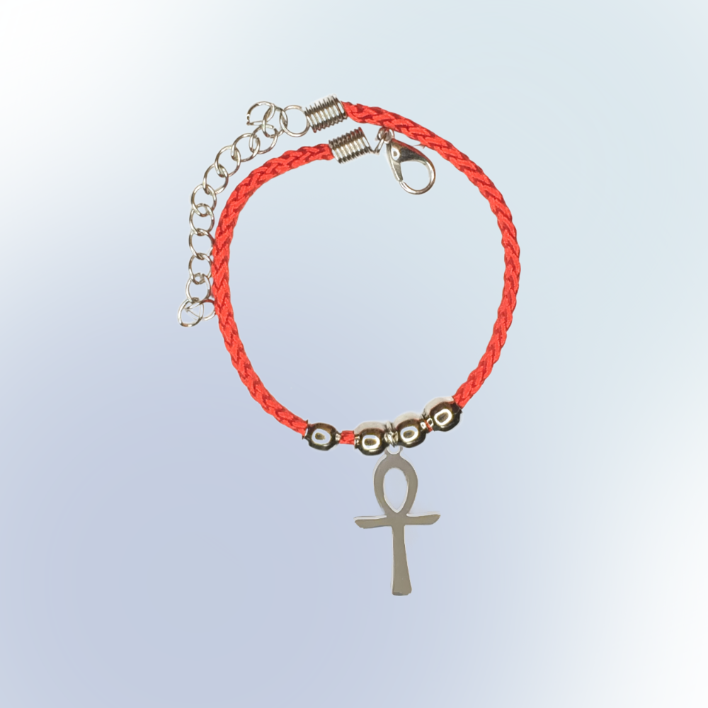 *** 1 Dije Cruz Egipcia o Ankh O Llave de la Vida + Pulsera Roja Borlas Hasta 21 cms de Perímetro Para Muñecas Desde Delgadas hasta Medianas ALTA DURABILIDAD ( DIJE CURADO) **