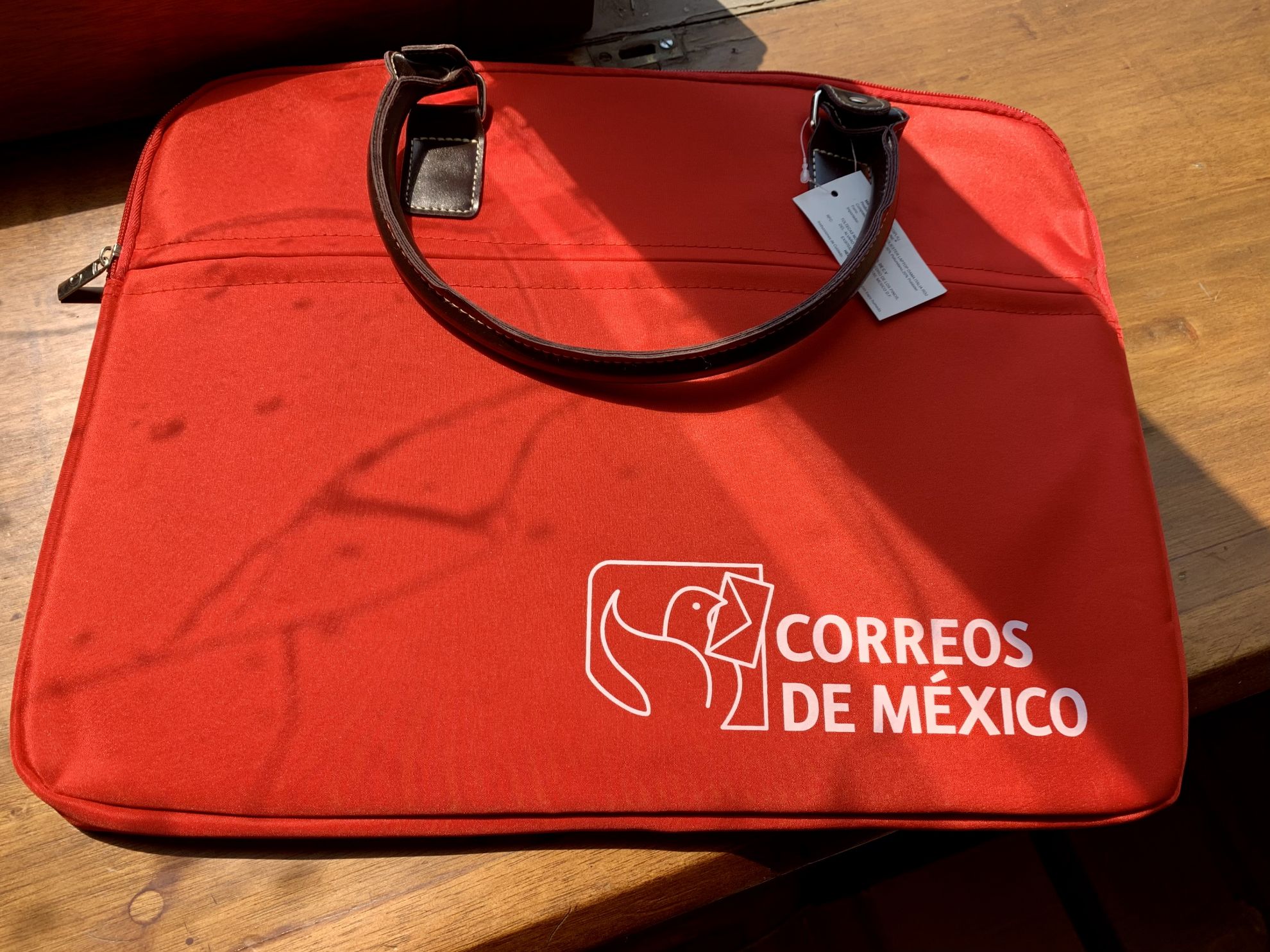 Bolso en color rojo con asas color café, con estampado de Correos de México, acolchonada por dentro con dos compartimientos.