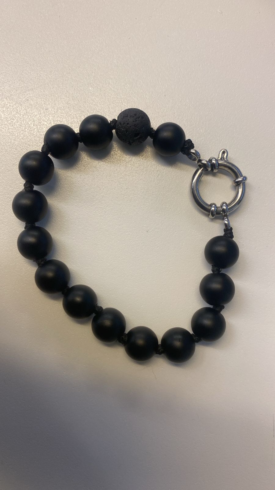 Pulsera con diseño de autor de piedras naturales (onix negro matte y roca volcanica) con broche de acero inoxicdable, elaborada con una tecnica de nudos intermedios entre cada pieza trabajada en hilo encerado.