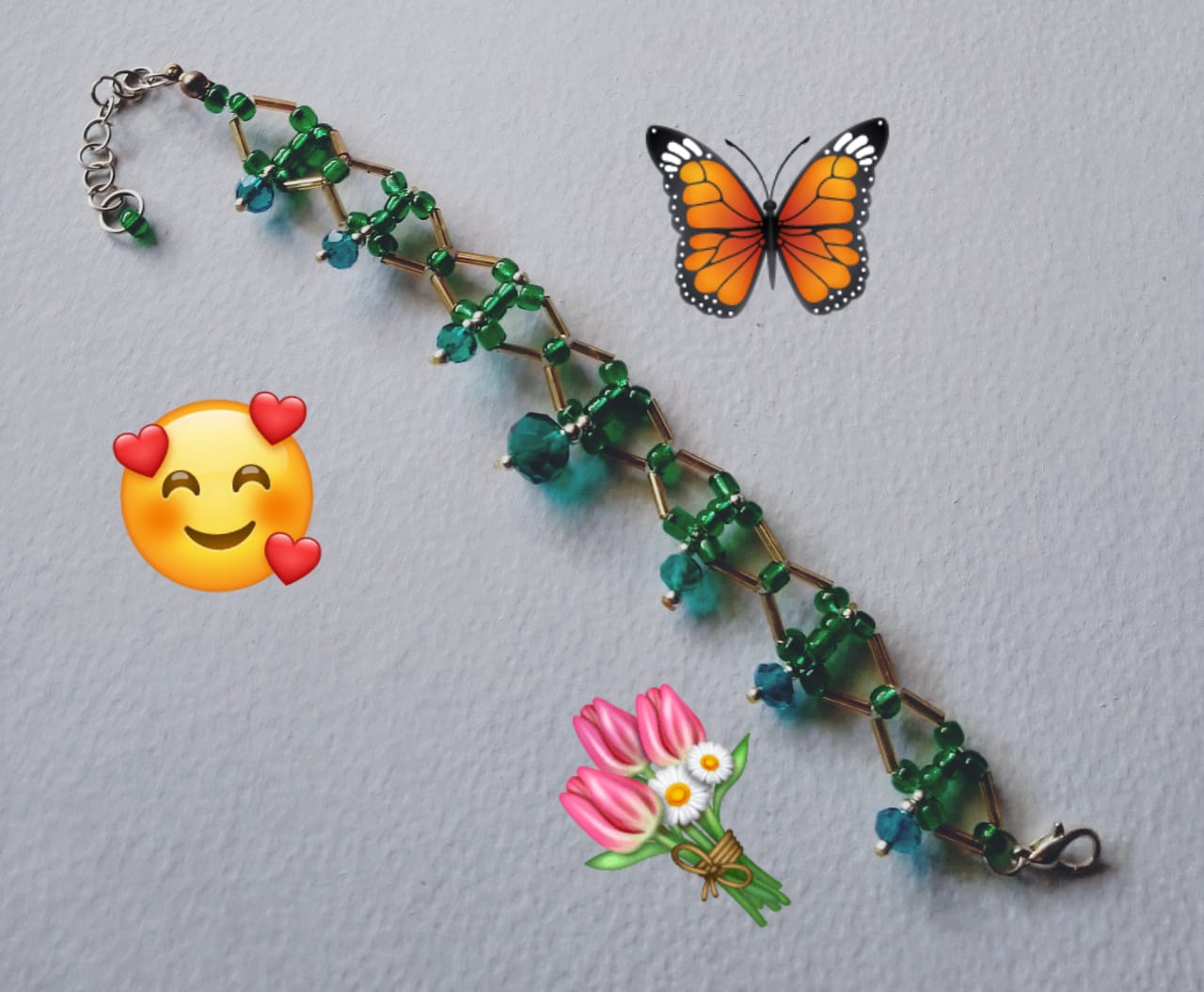 Set de 3 pulseras elaboradas con cuentas de cristal con forma semejante a una corona, una en color azul, una en color roja y una mas en color verde de longitud 17cm extendible a 21 cm aproximadamente, terminacion con ganchito de un lado y cadenita del otro.