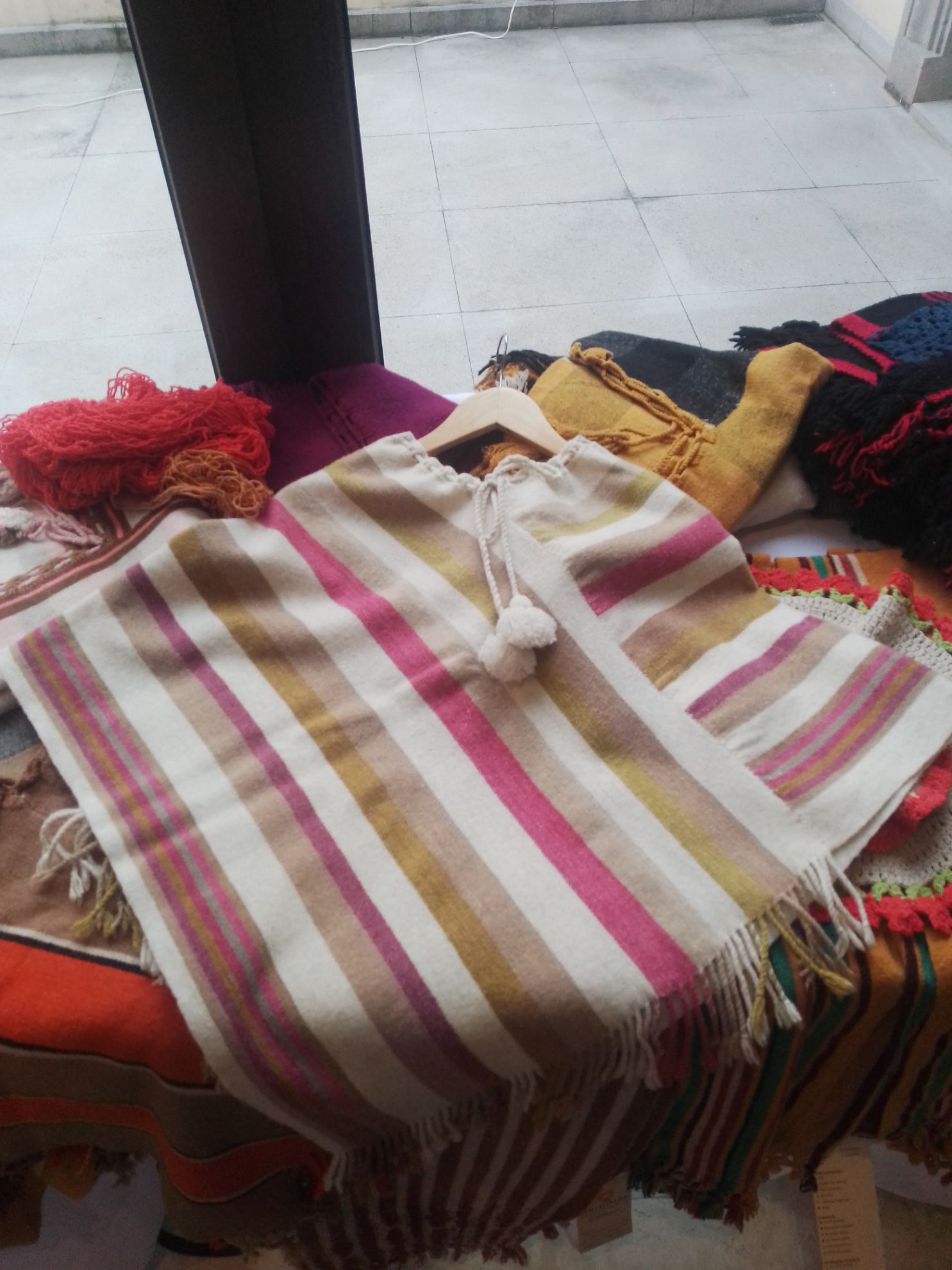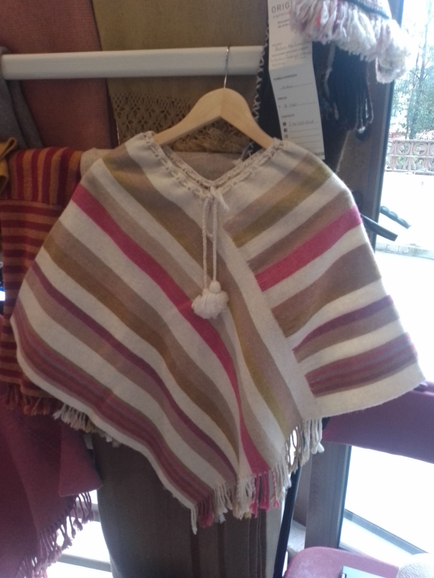 Capa de lana tejida con telar de cintura, teñida con tintes naturales como cáscara de nuez, grana cochinilla y hojas de pericon.