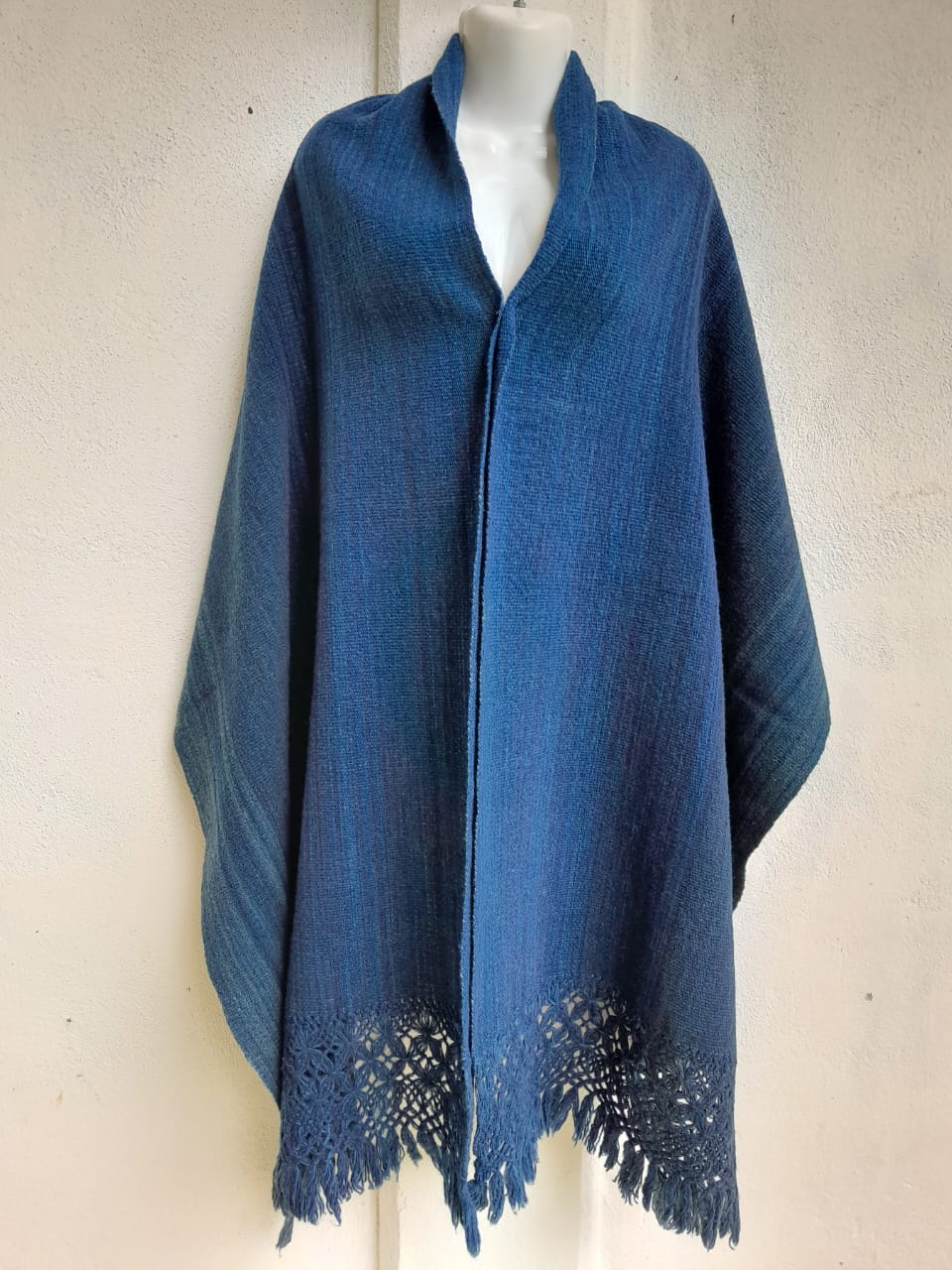 Teñido con tintes de azul añil, terminado con motivos geométricos.