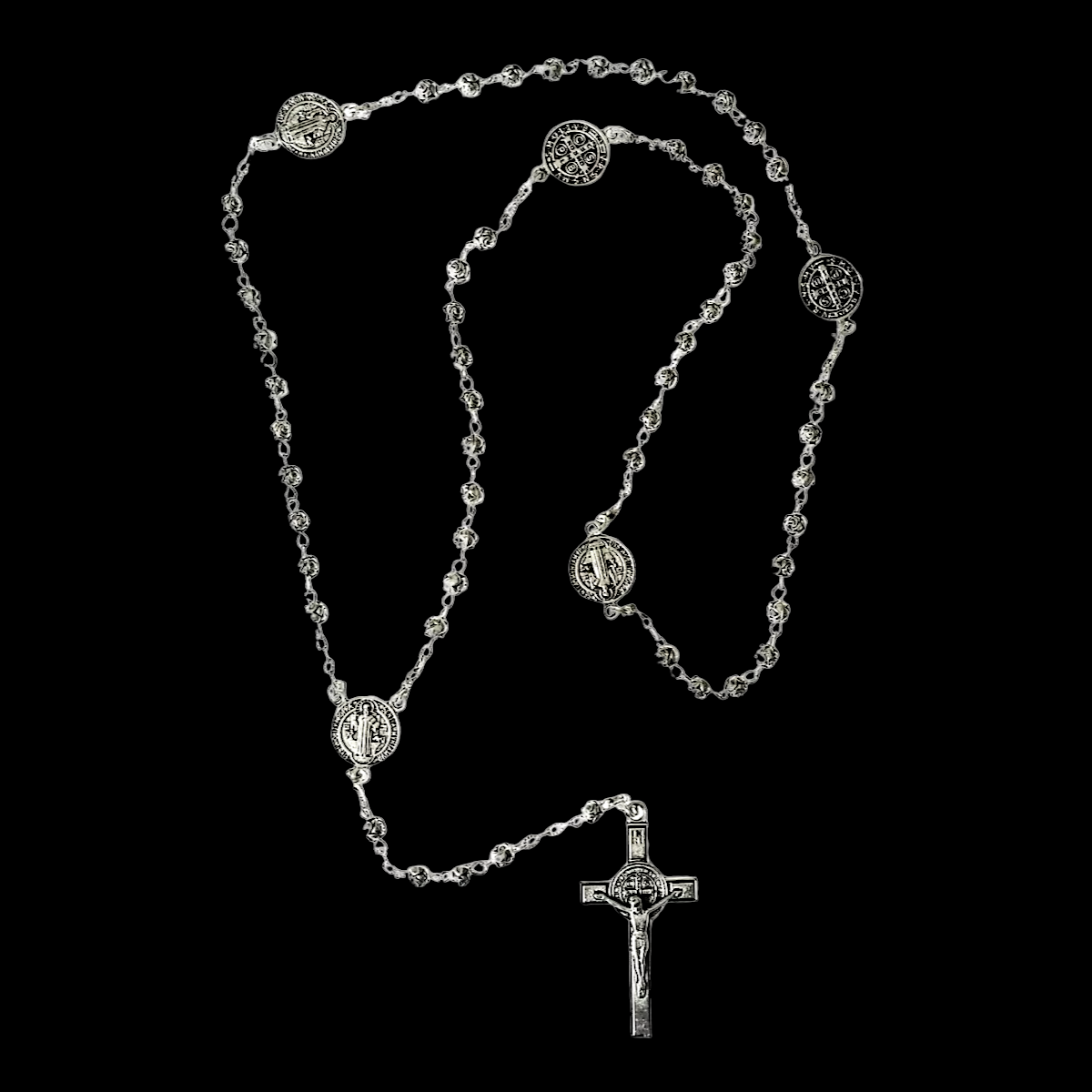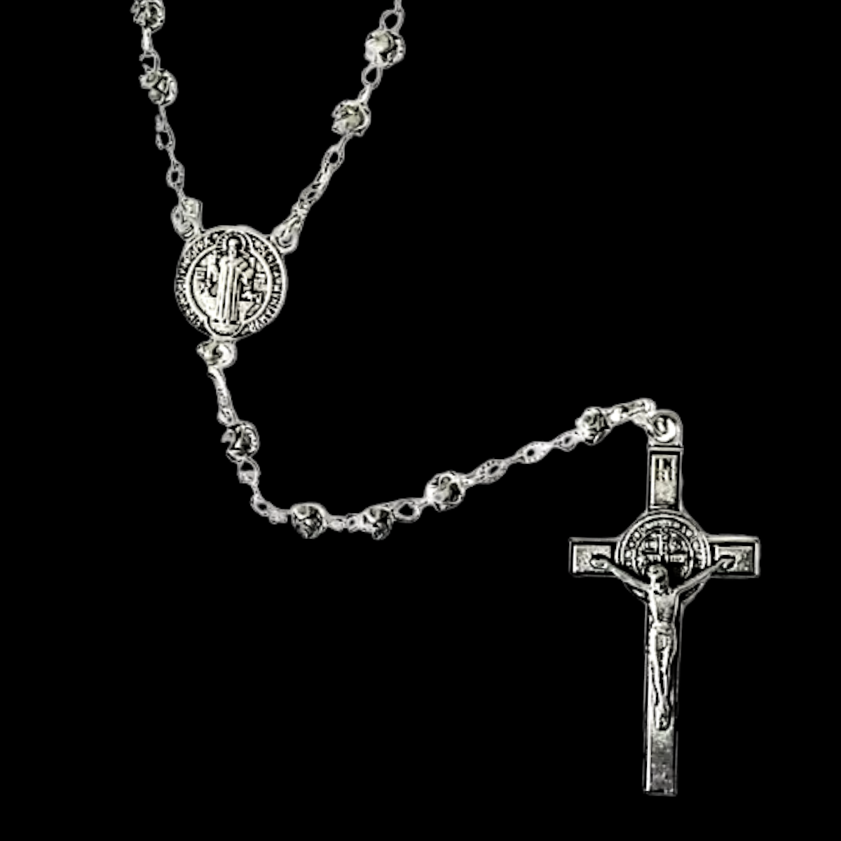 ***ROSARIO SAN BENITO 4MM, TIPO PLATA VIEJA***-BAÑO DE PLATA-CUENTA METALICA CON ROSA GRABADAS 4MM-MIDE 42.5CM DE LARGO APROXIMADAMENTE-INCLUYE ESTUCHE DE ACRILICO TRANSPARENTE-CRUCERO METALICO DE SAN BENITO¡¡¡ SOMOS FABRICANTES!!!