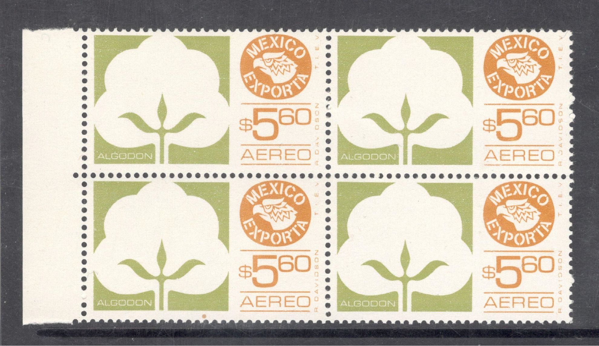 BLOCK DE 4 ALGODÓN DE $5.60 SERIE EXPORTA PRIMERA SERIE FOSFORECENCE AL ANVERSO GOMA BRILLANTE EN CONDICIÓN MINT MNH EL PRECIO INDICADO ES POR UN BLOCK CON LAS 4 ESTAMPILLAS