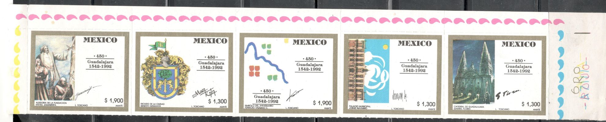 SERIE DE ESTAMPILLAS EMITIDAS POR EL 45' ANIVERSARIO DE LA CIUDAD DE GUADALAJARA EN 1992.