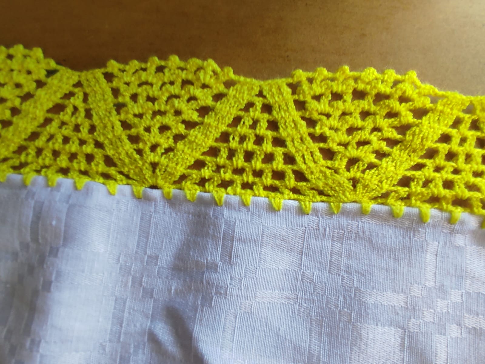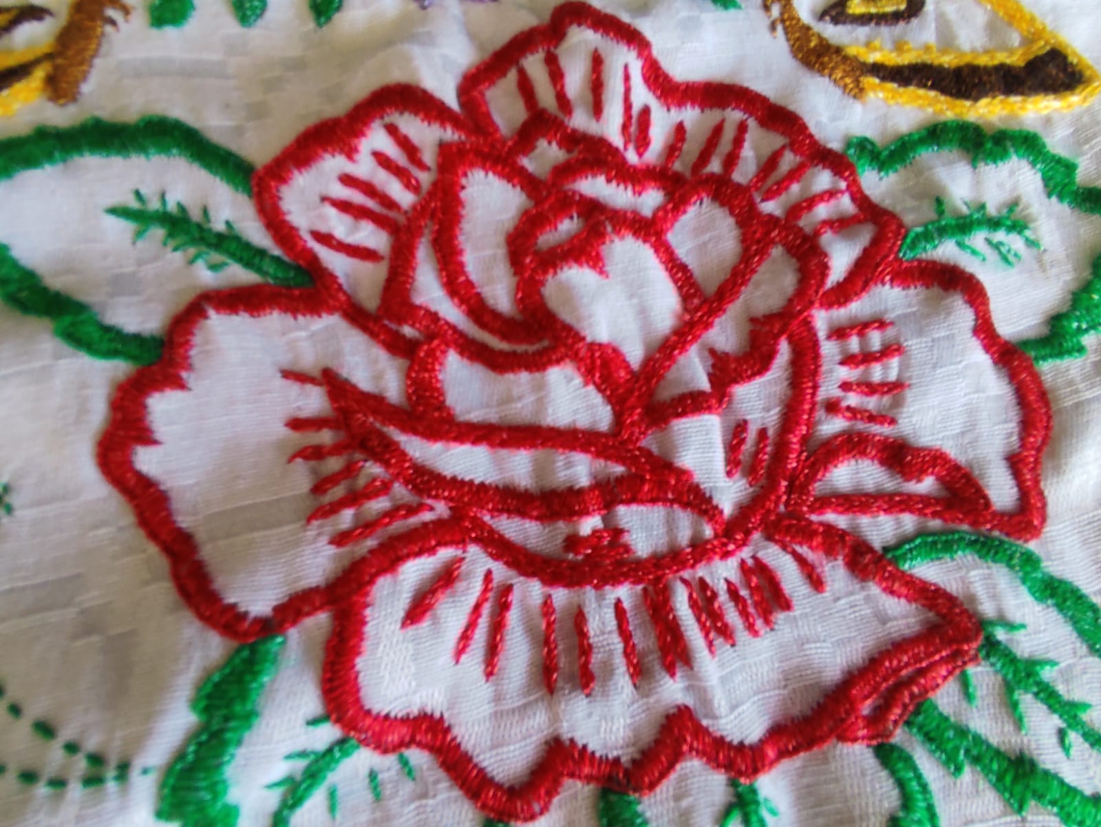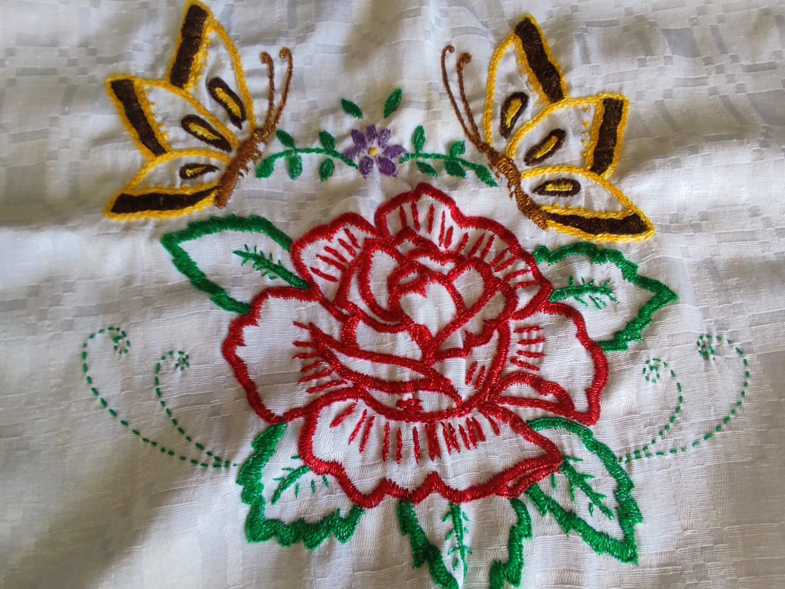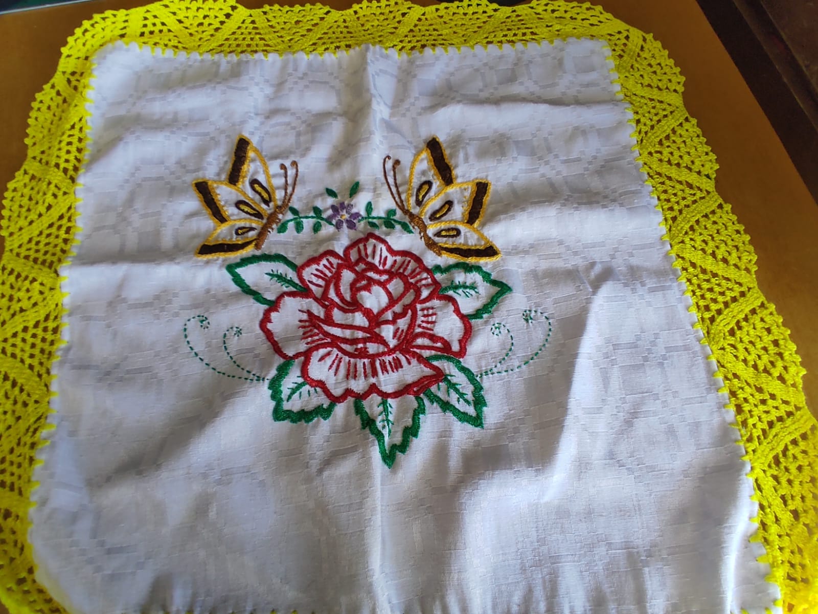 Estampado de mariposa color amarillo con detalles cafe, en el centro lleva una rosa de color rojo y detalles verdes en las hojas, la orilla esta bordad de color amarillo como un aproximado de 6 centimetro.