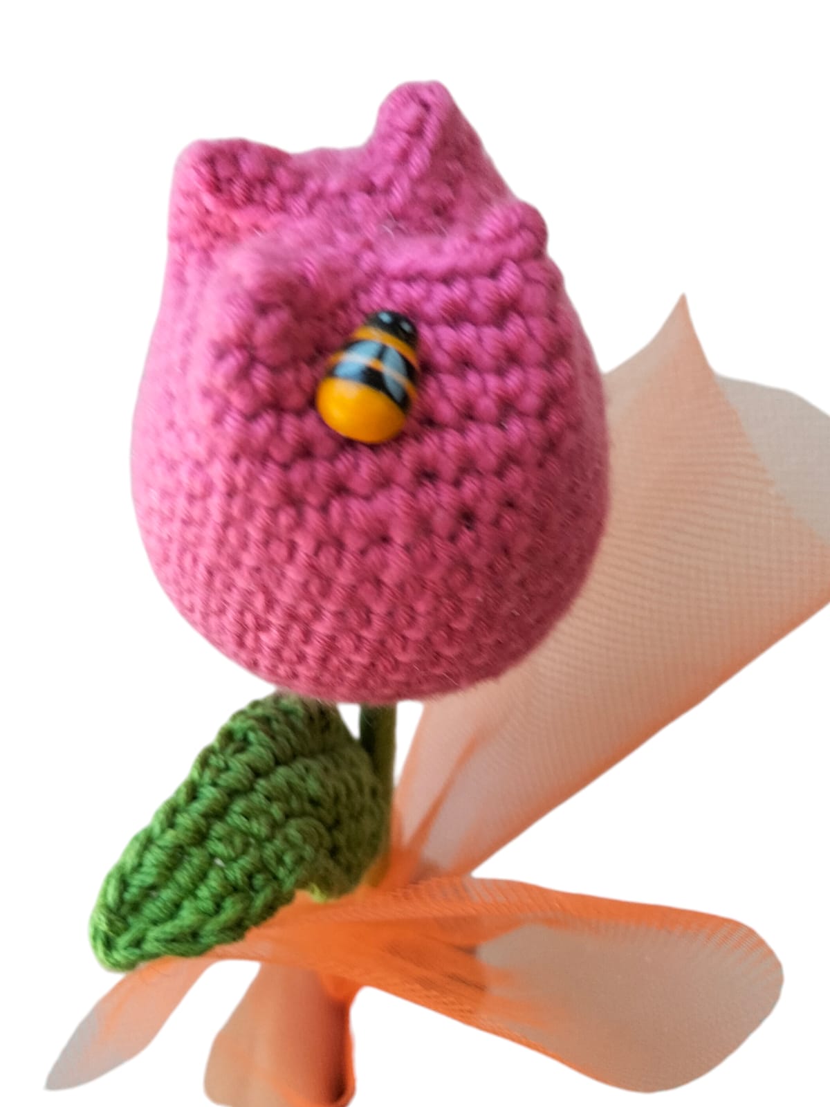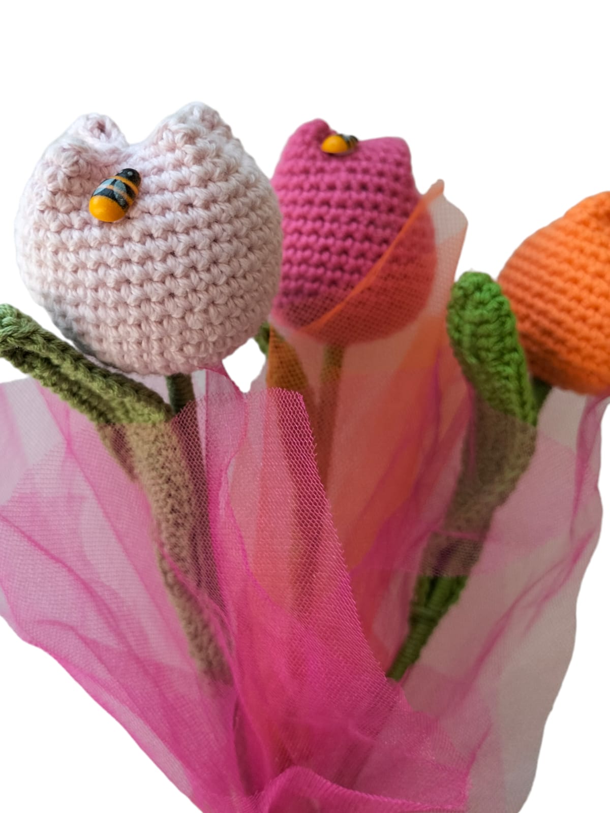 Flores tejidos en hilaza de algodón haciendo juego de 3 pzas. Cada bulbo de 6 cms el largo total es de 22 cms.