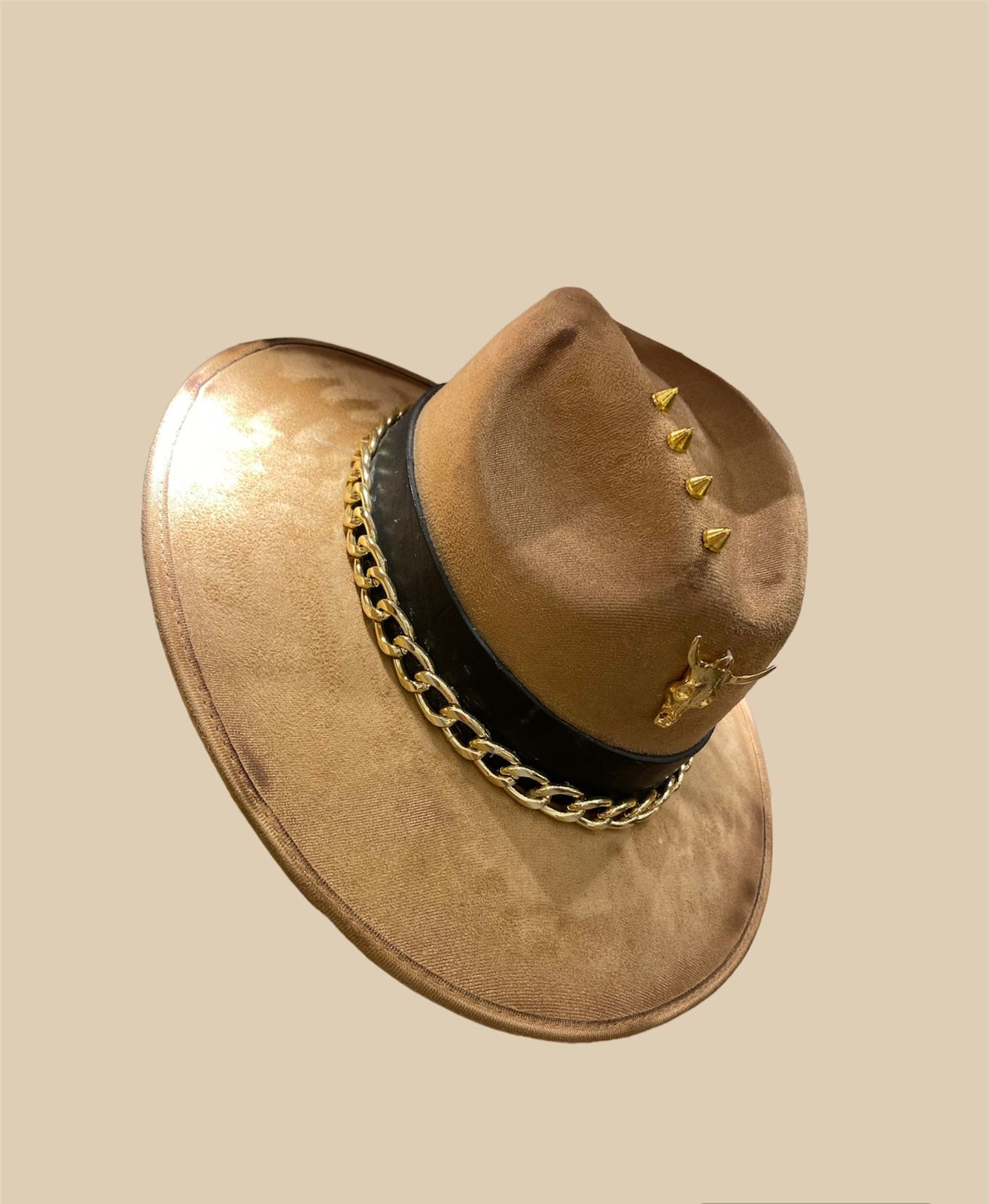 Sombrero de gamuza con accesorios de acero inoxidable.