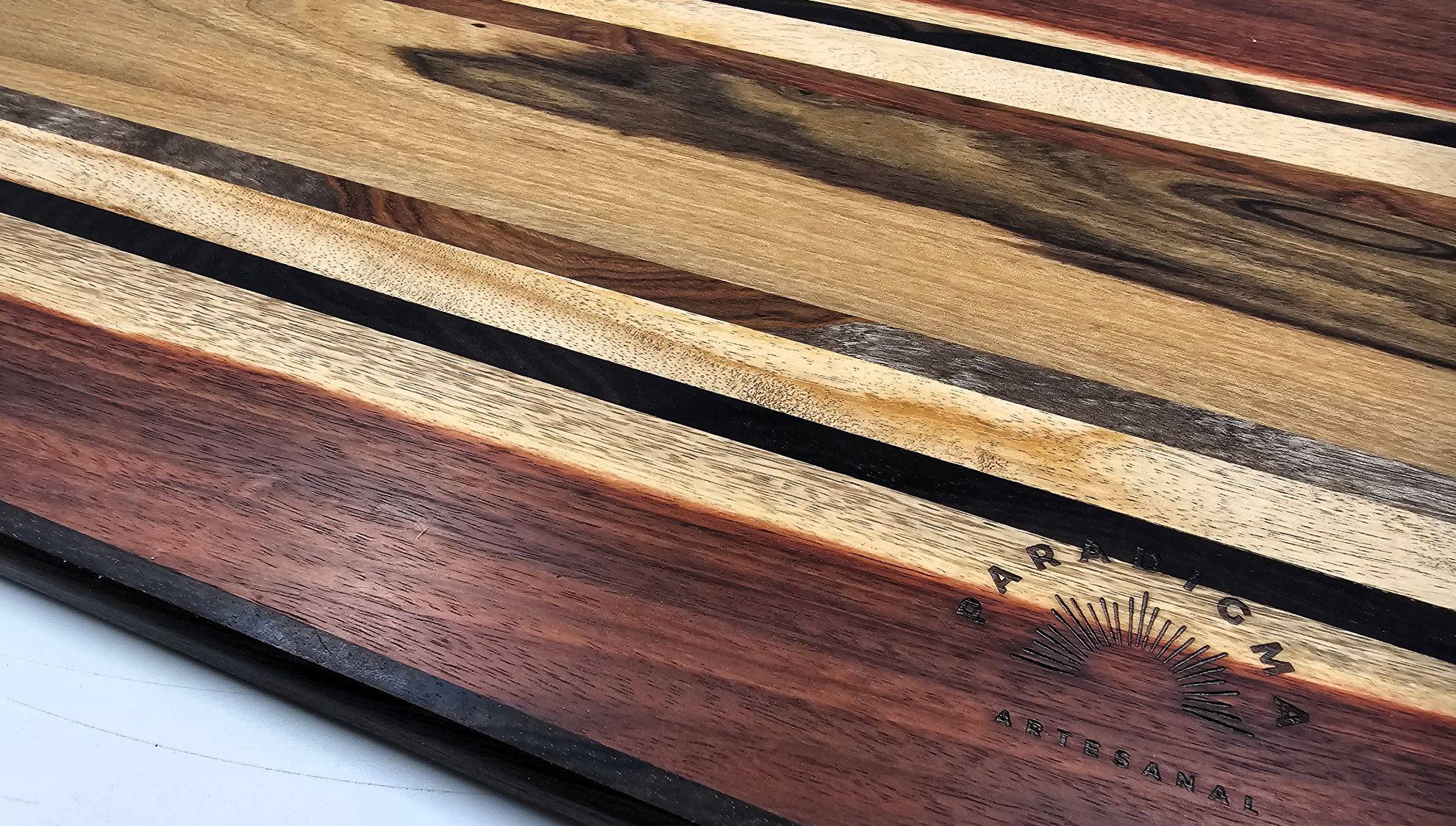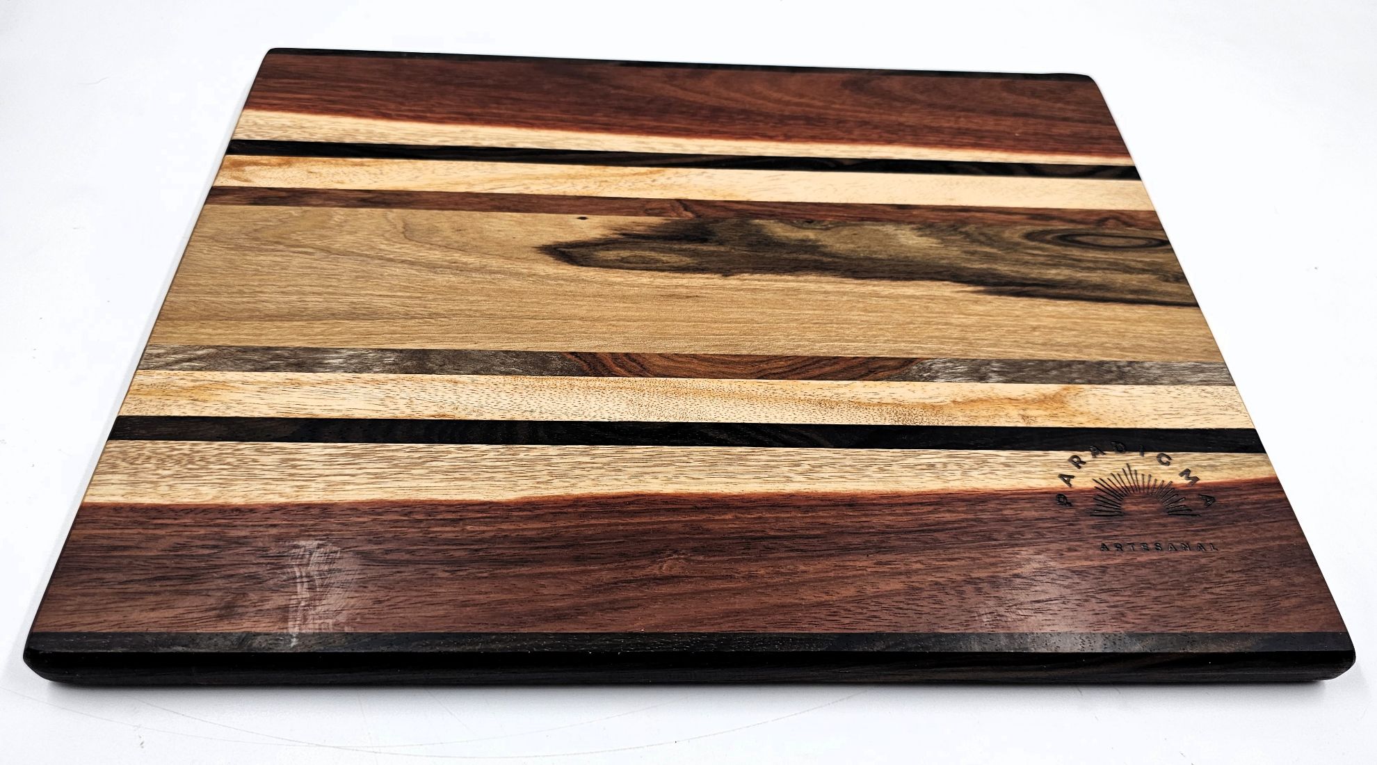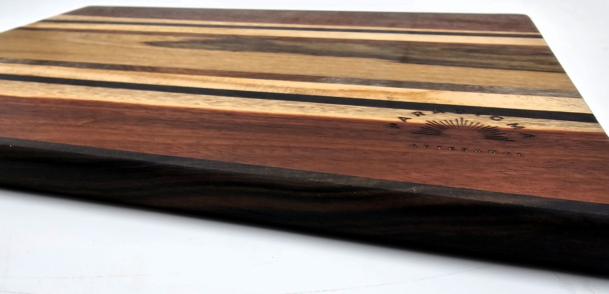 Hermosa Tabla para Alimentos elaborada artisticamente con Maderas Tropicales Exoticas comos: Granadillo, Bojon, Ziricote, Chechen, Kitinche y Zapote. Todas son maderas duras, por lo que el tiempo de vida util de este productos sera extenso. Tratada la madera con aceite mineral y cera de abeja de grado alimenticio.