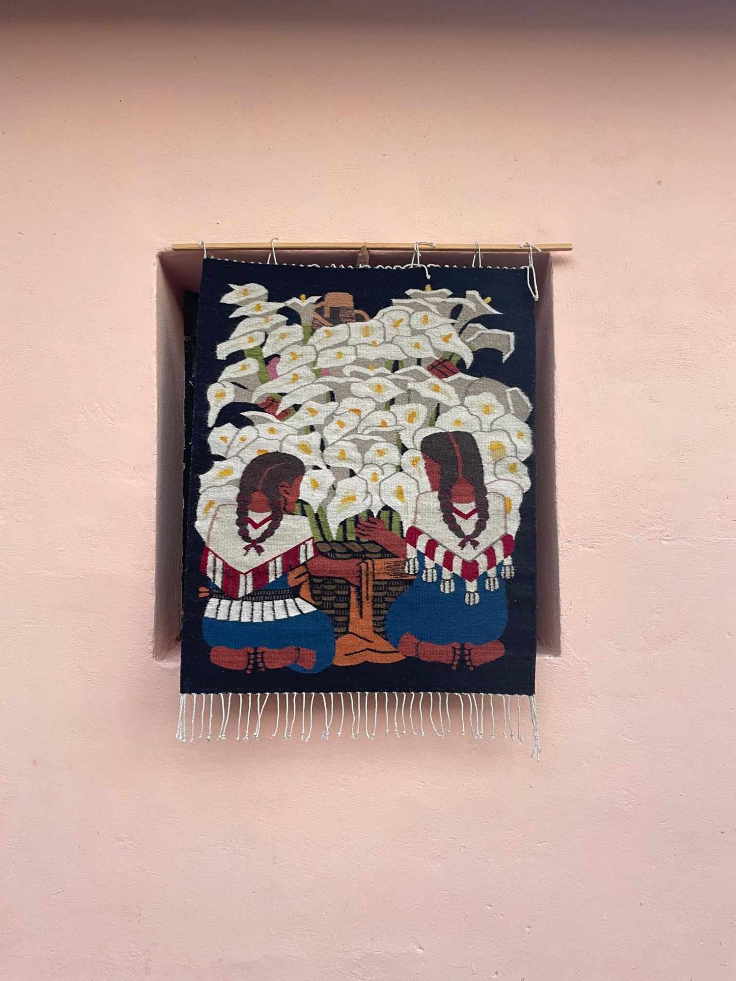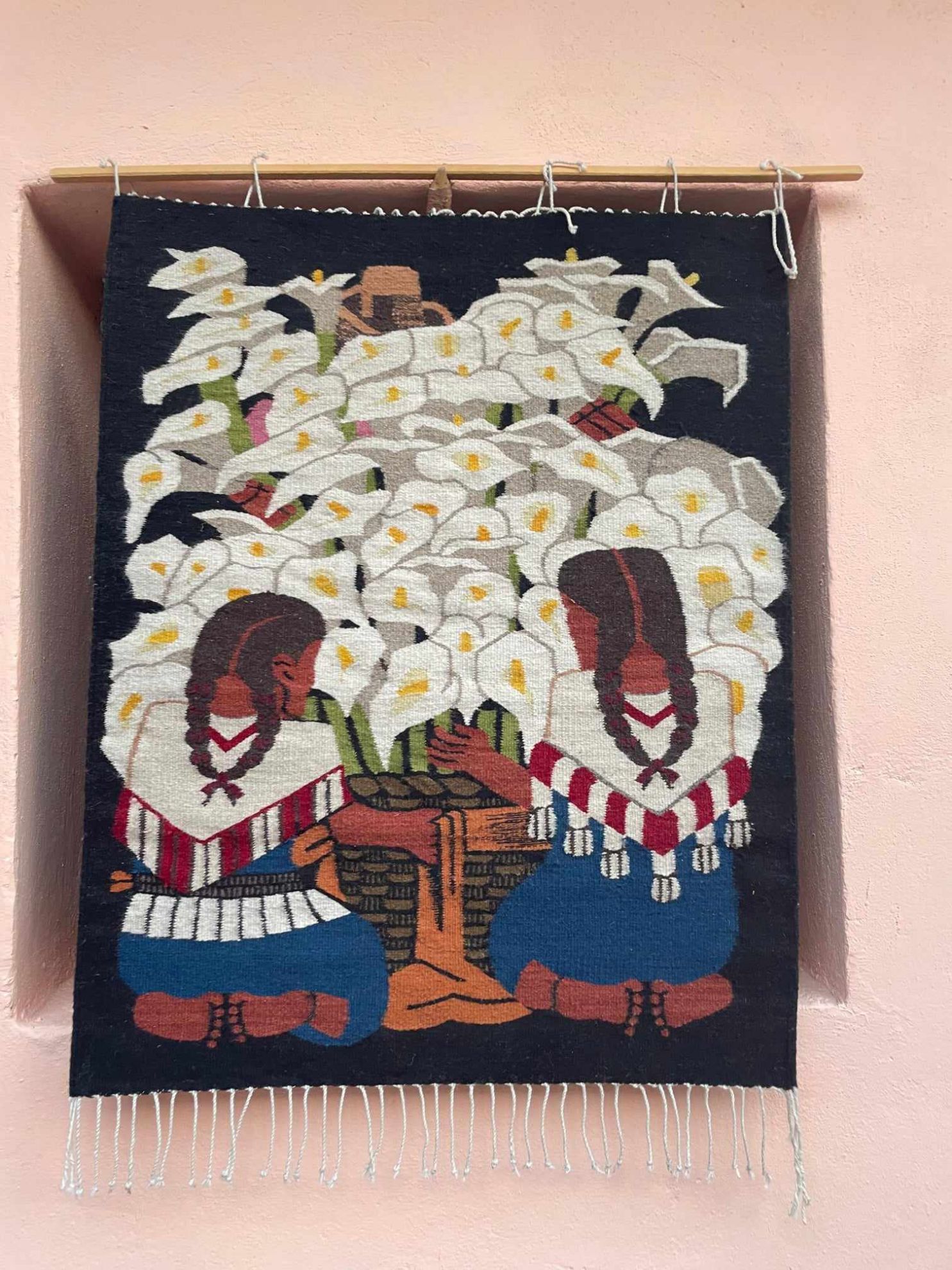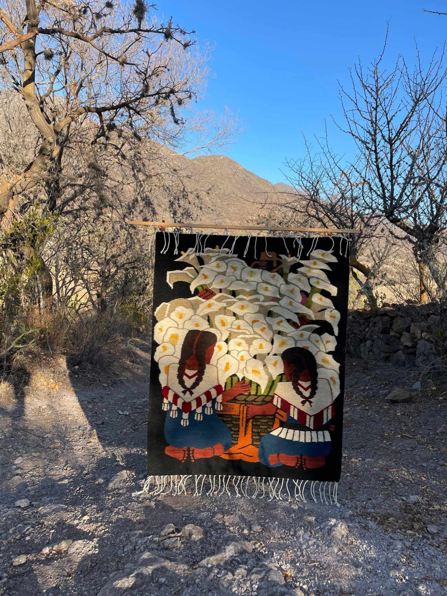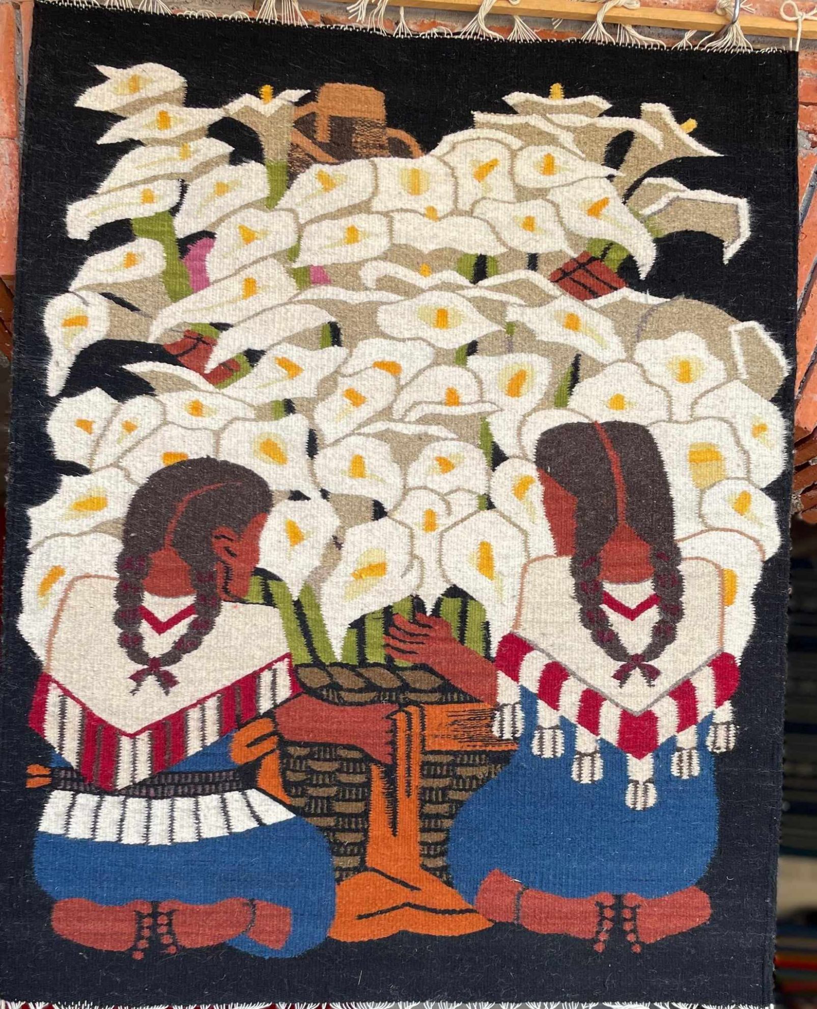tapete 100% de lana,elaborado con tintes naturales,trabajo realizado totalmente a mano una replica de la pintura de Diego Rivera llamada VENDEDORA DE ALCATRACES