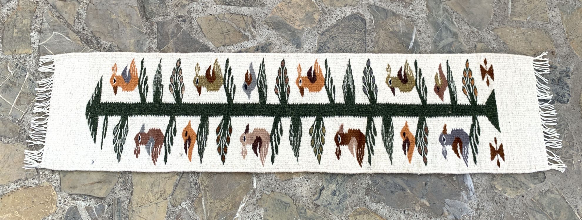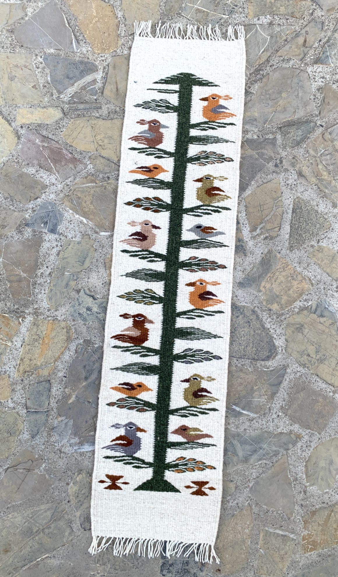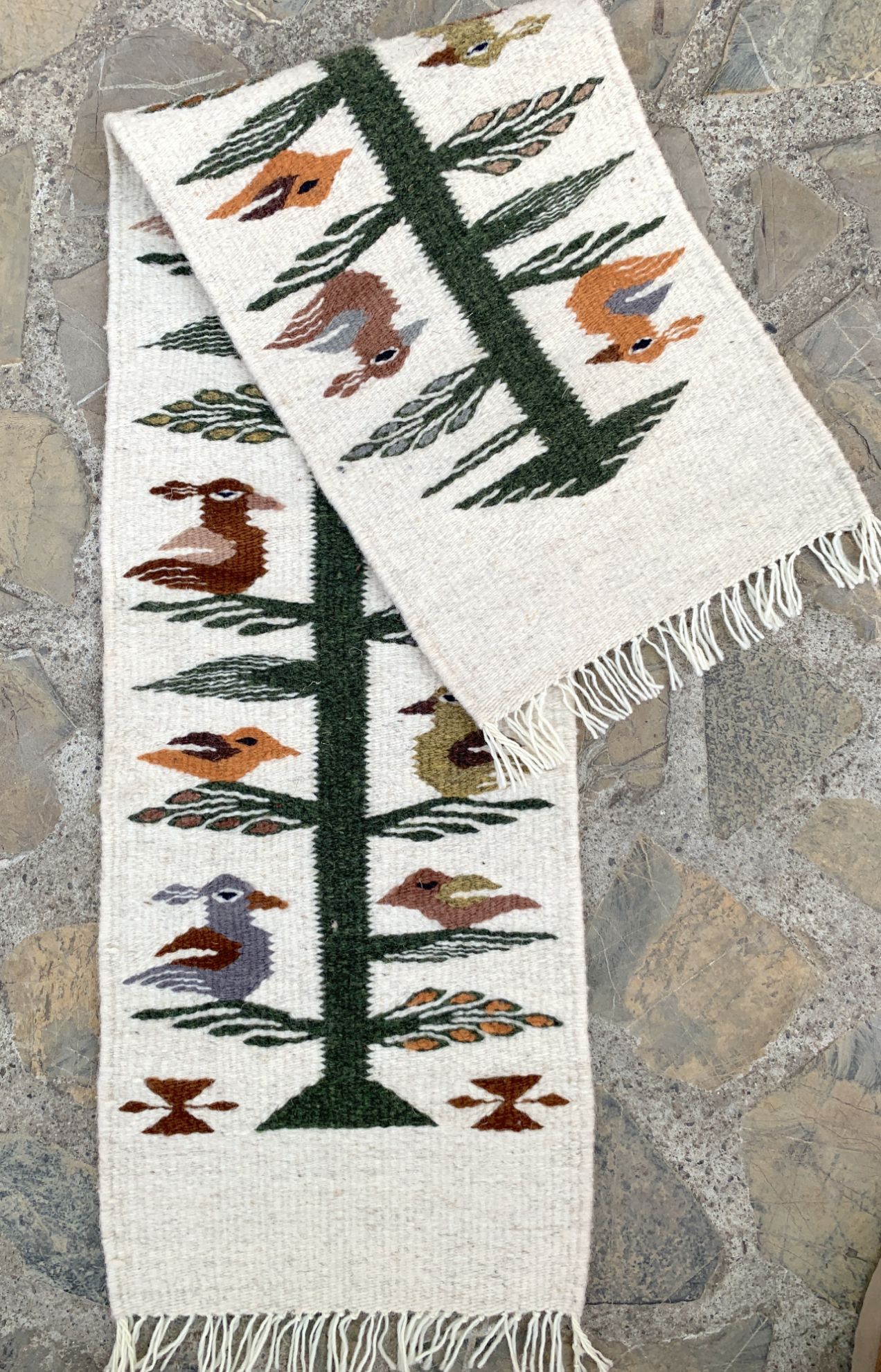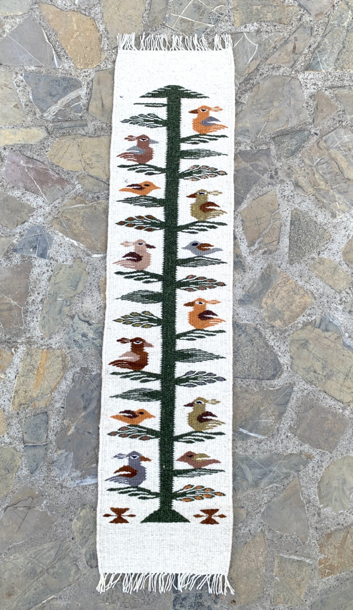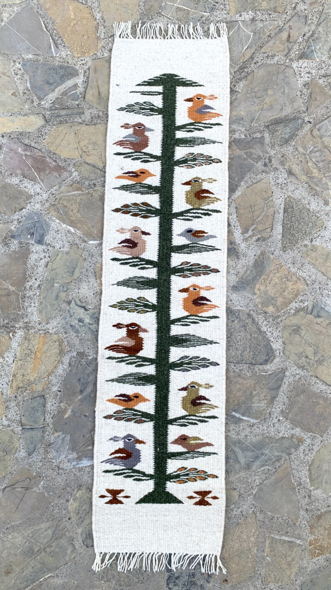 Pasillo para Camino de Mesa color blanco natural y suave con diseño Árbol de vida tejido a mano con lana de borrego