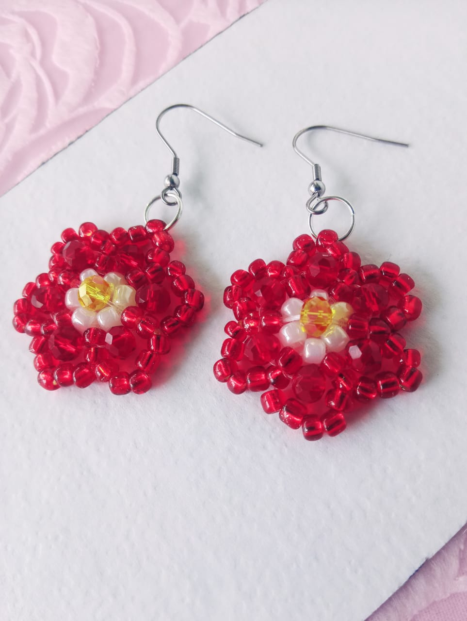 Arete 2: arete de flor elaborado con cuentas de cristal cortado rojo y chaquiron rojo tambien para los petalos, con centro en color blanco y amarillo, con ganchitos de acero inoxidable, tamaño de la flor 3.5 cm.