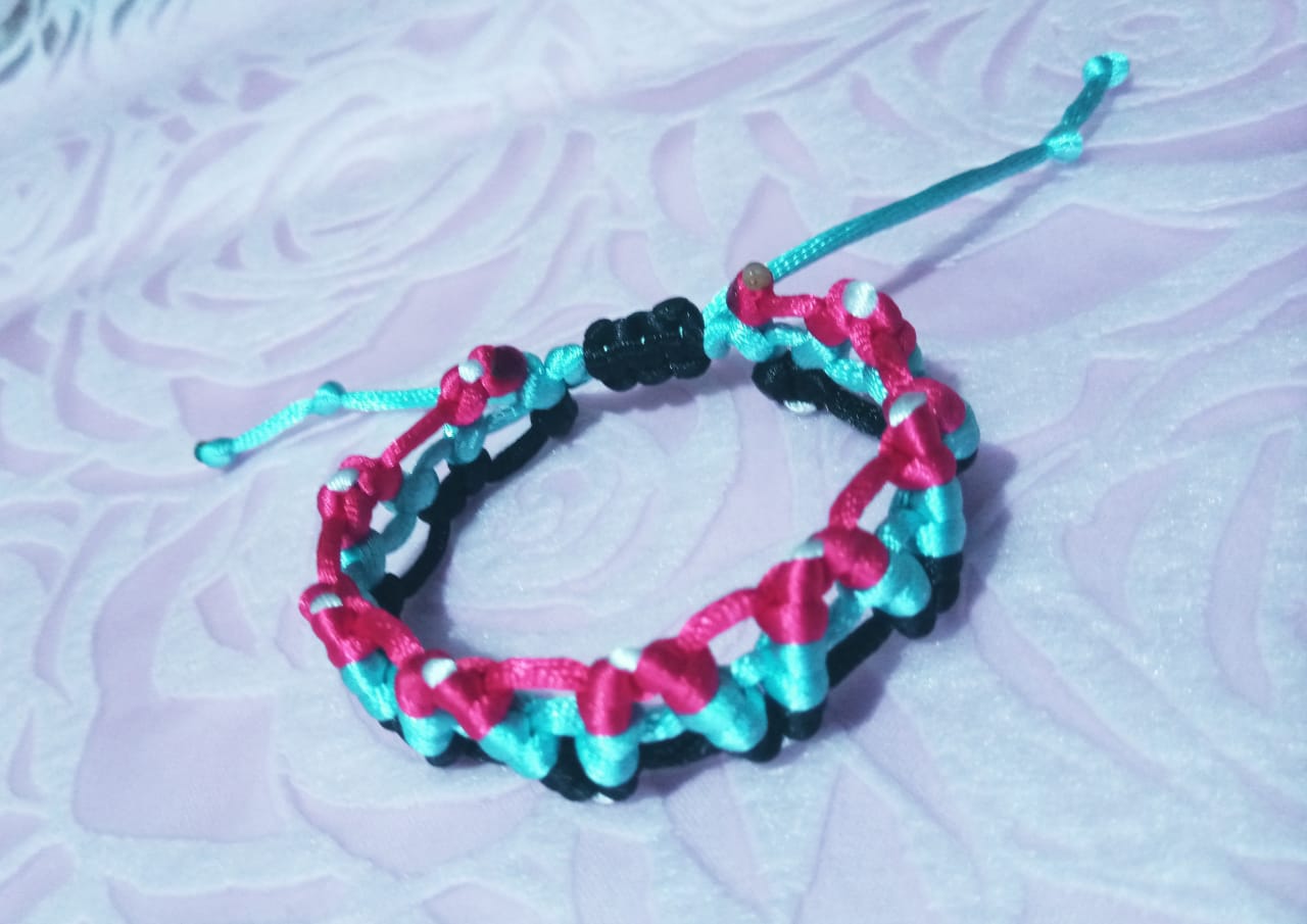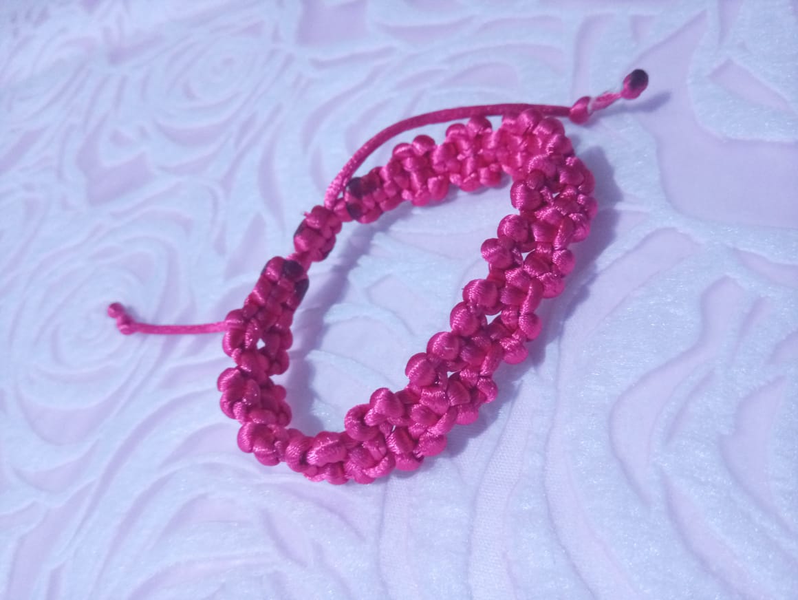 Set de 3 pulseras elaboradas con hilos de cola de raton. El set incluye una pulsera zigzag color amarillo de hilo delgado, una pulsera fucsia de hilo grueso y una tercera pulsera zigzag tricolor (rosa, azul y negra) de hilo grueso, de longitud 15 cm extendible a 22 cm aproximadamente, terminacion con nudo macrame plano.