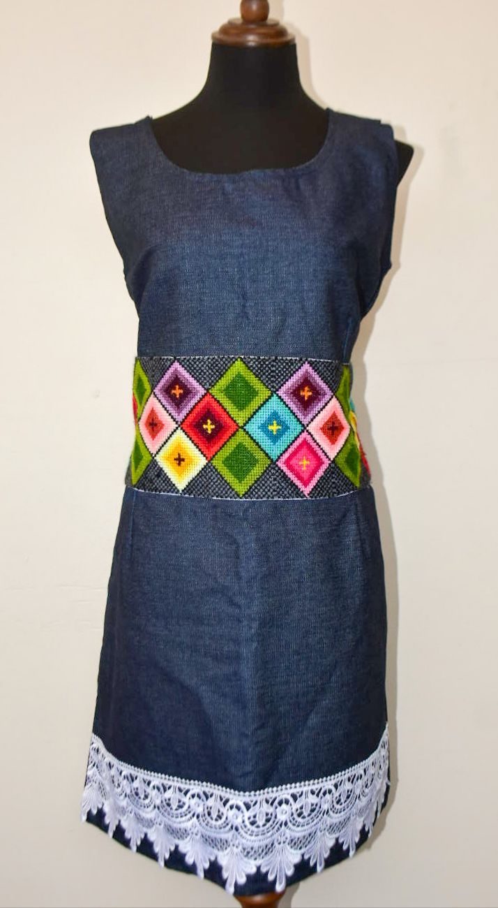 Es un vestido con bordado de punto de cruz hecha a mano con encaje
