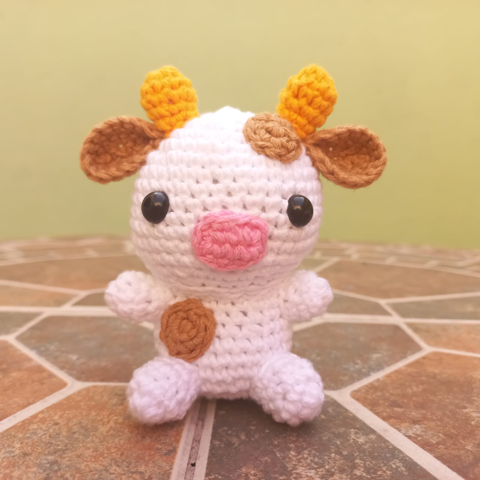 Vaquita peluche tejida a mano a crochet con la técnica amigurumi.