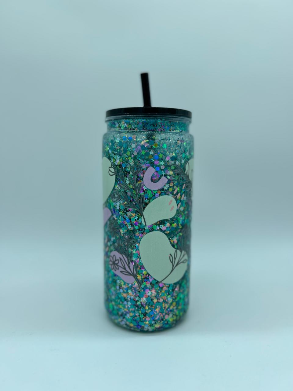 Vaso doble pared 20oz. Hecho con glitter en tonos azules y rosados con dorado