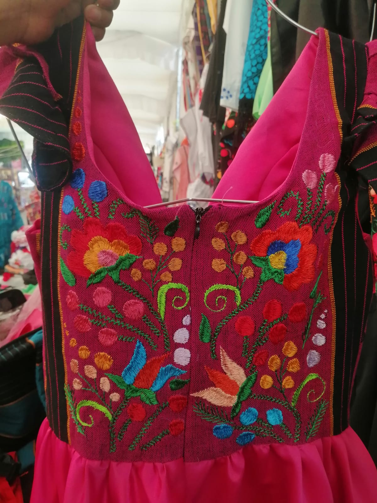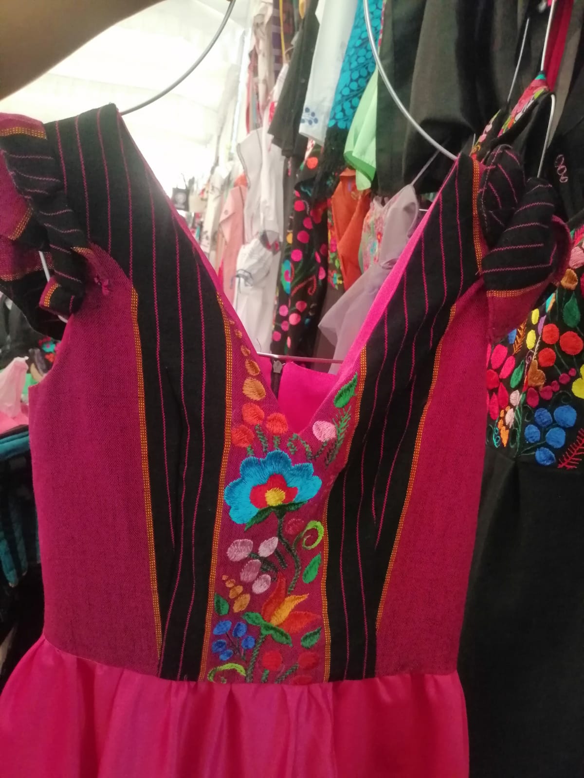 Vestido corte v, en talla mediana, bordado a mano en flores pequeñas en telar de pedal en el pecho, confeccionado en tela razo en el faldón y pecho con telar de pedal. Cuyo bordado se puede apreciar en la parte de abajo en el pecho y en la espalda, un bordado totalmente a mano con hilos iris Rayón. Sobre pedido se puede realizar sobre medida o en talla chica, mediana y grande. El bordado es con la técnica de bordado de la comunidad de Acatlán municipio de Chilapa de Álvarez, Guerrero.